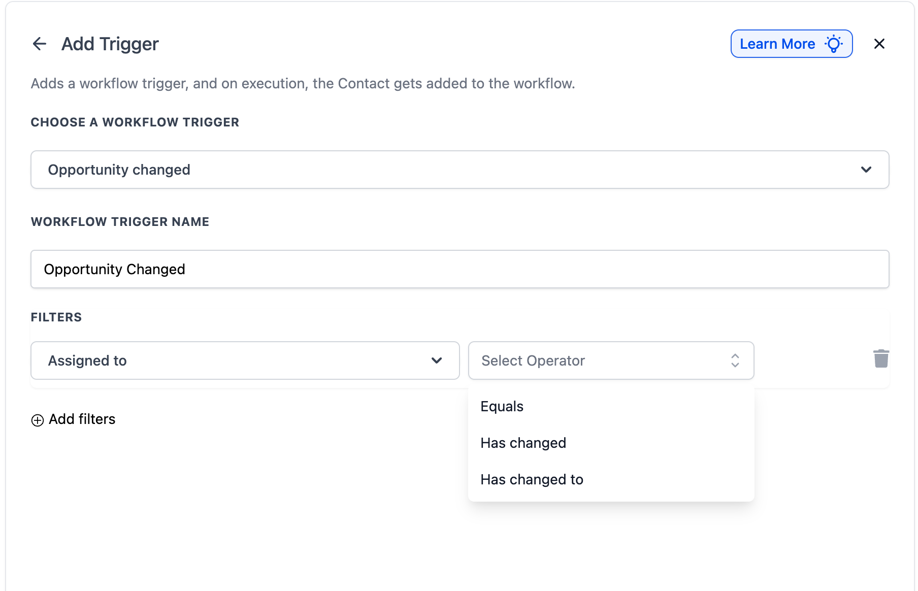 The Assigned To filter triggers the workflow when an opportunity is reassigned to a different team member. This is particularly useful for sales and support teams that manage leads collaboratively. By using this filter, businesses can automate follow-up actions when ownership of an opportunity changes, ensuring a smooth handoff between team members.