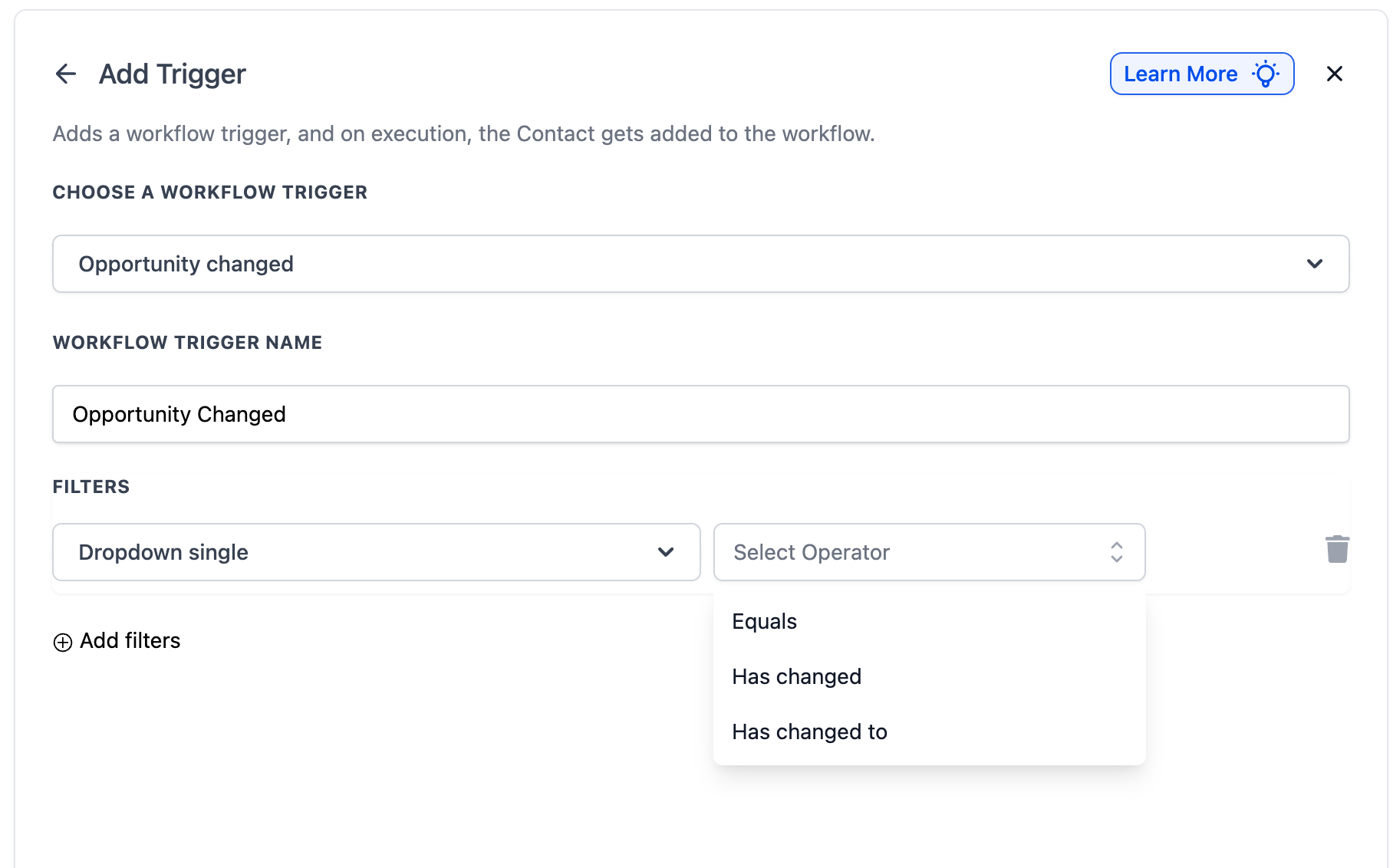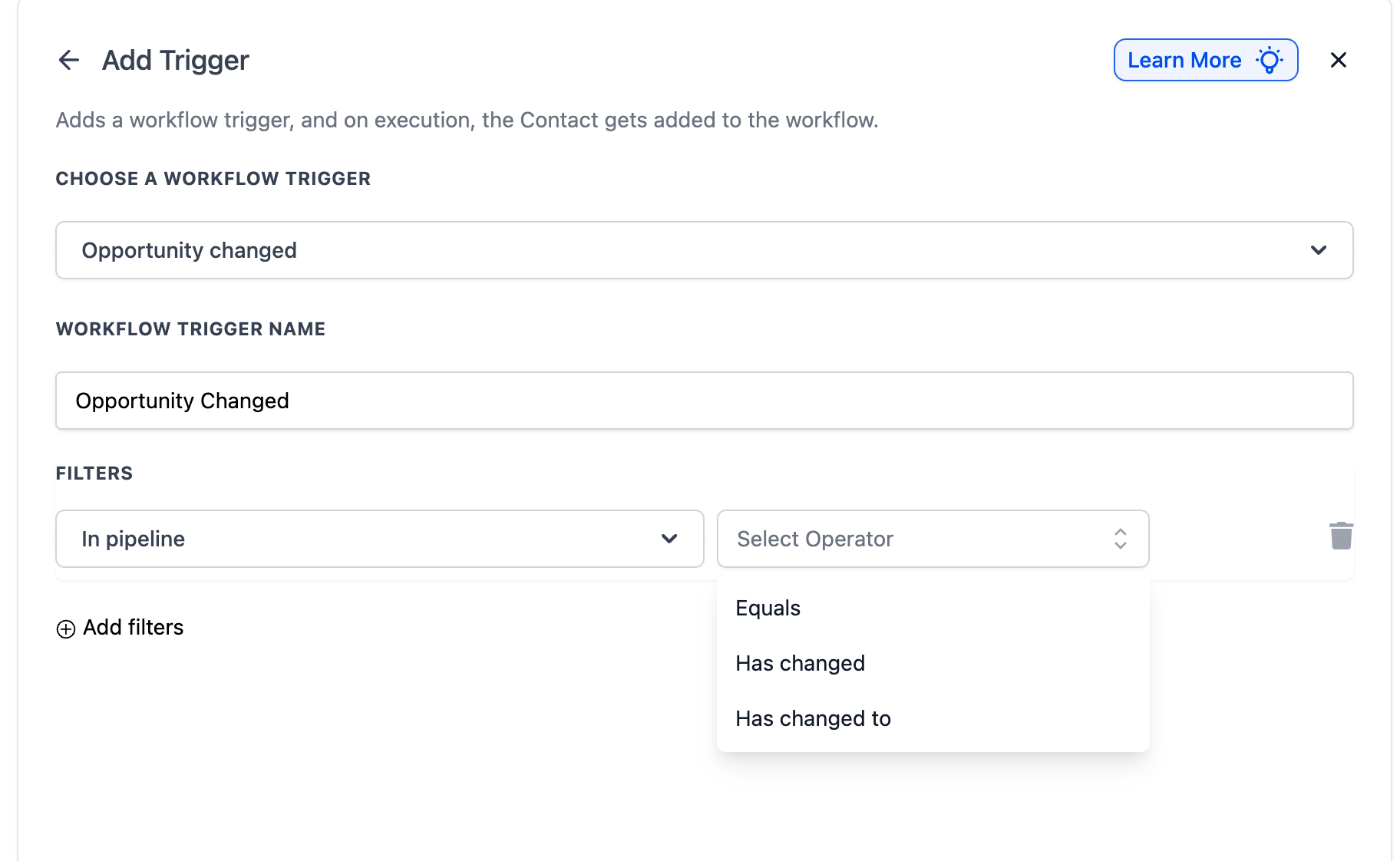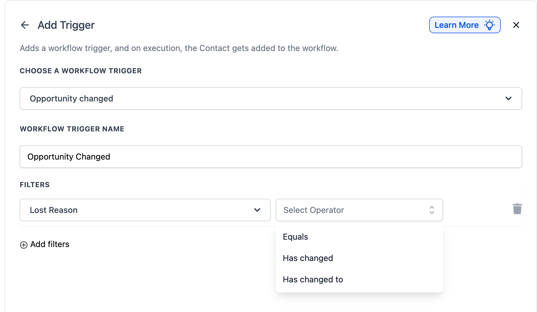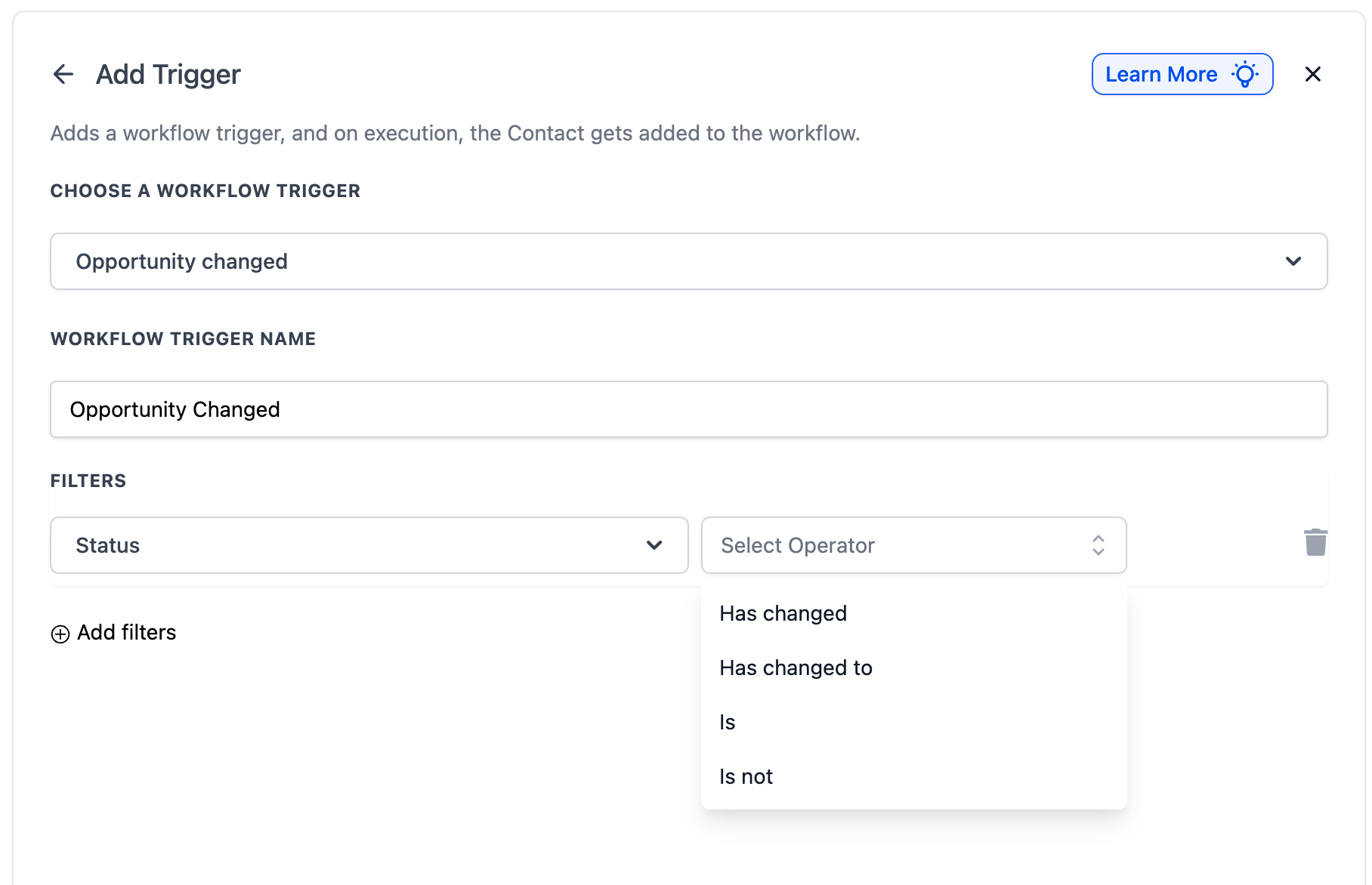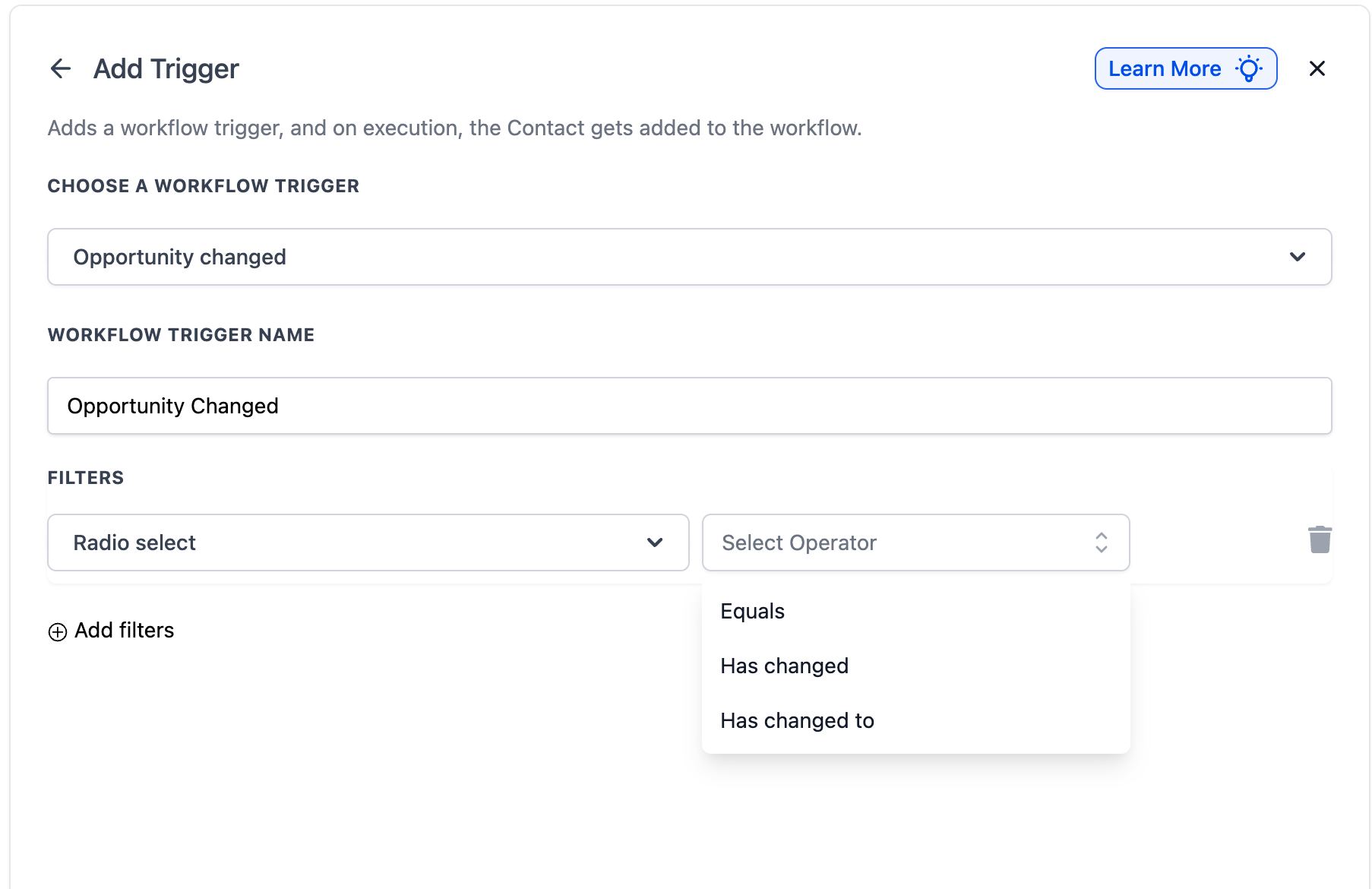 Filters help fine-tune your workflow so it only triggers when specific changes happen to an opportunity.