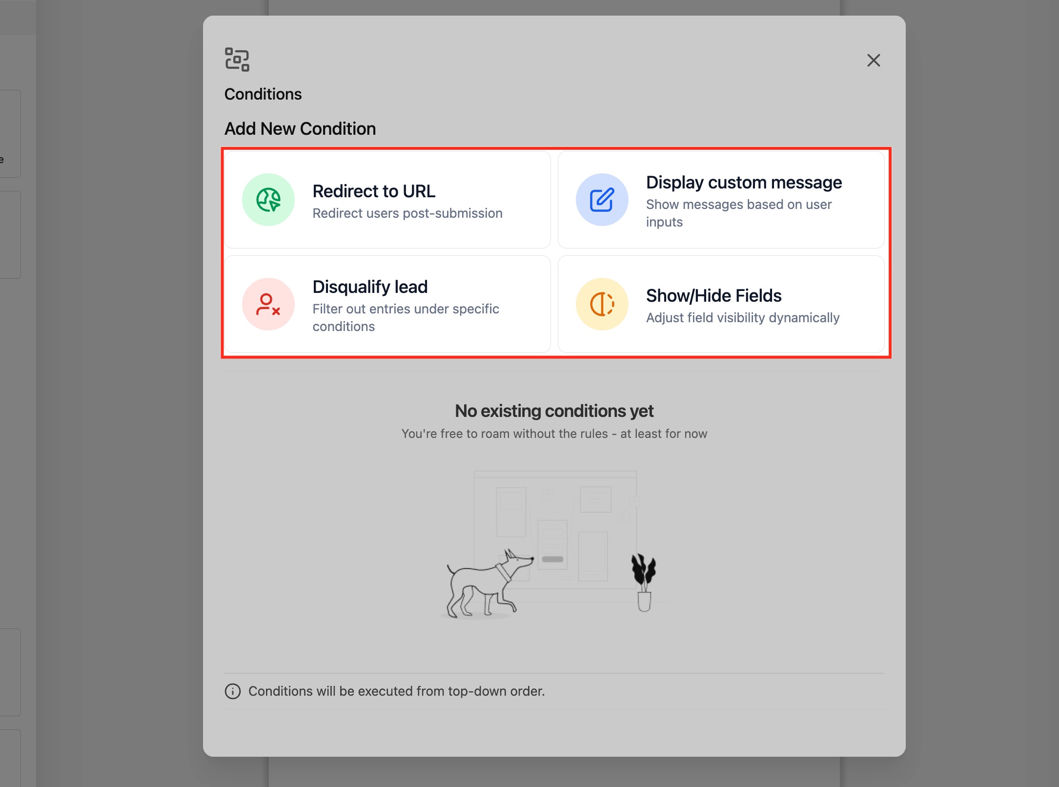 Conditional Logic v2 helps you create smarter, more dynamic forms and surveys. It lets you show or hide fields, redirect users, display messages, disqualify leads, or jump to different slides — all based on how someone answers.