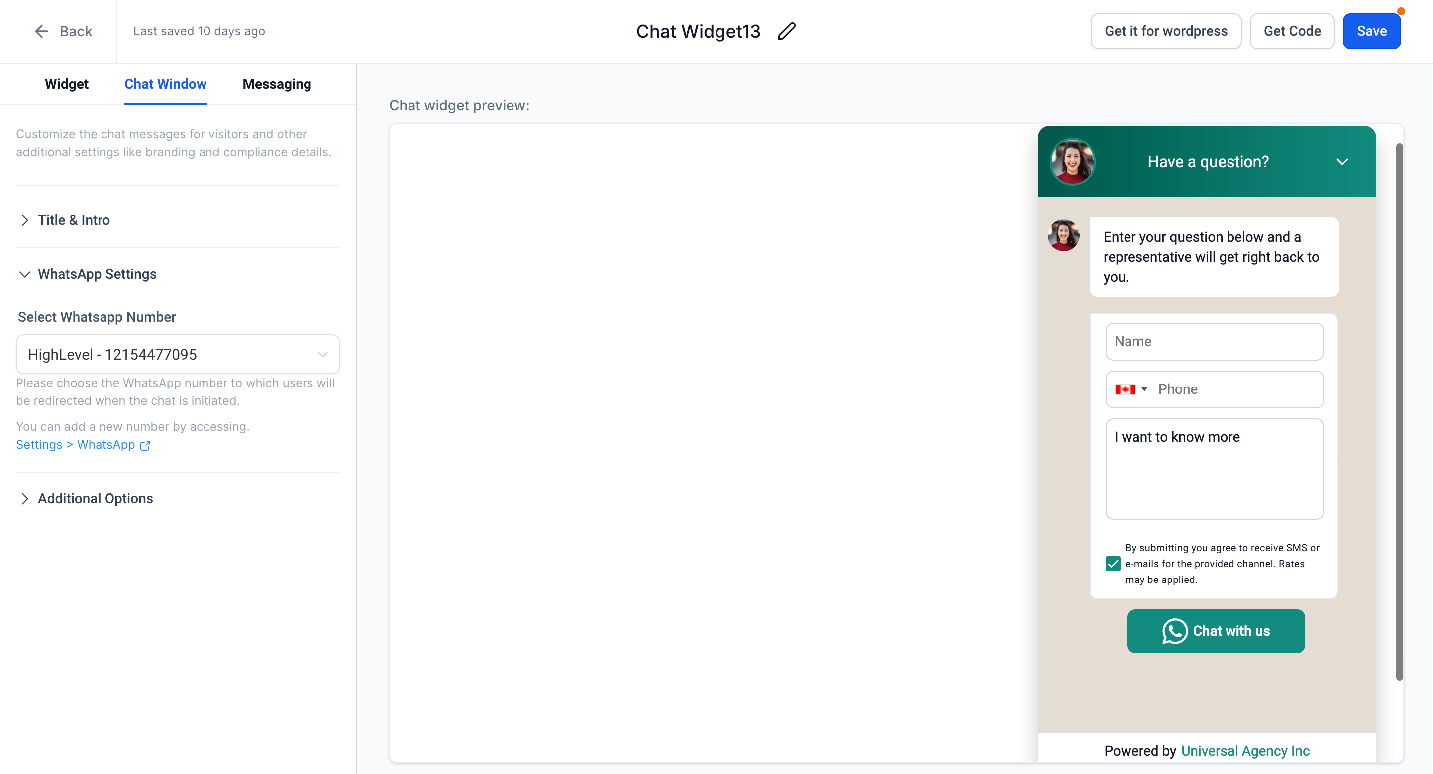 4. Once the setup is done, the last part is to select the WhatsApp number. This is the number to which the message from the user will be redirected to when the chat is initiated.