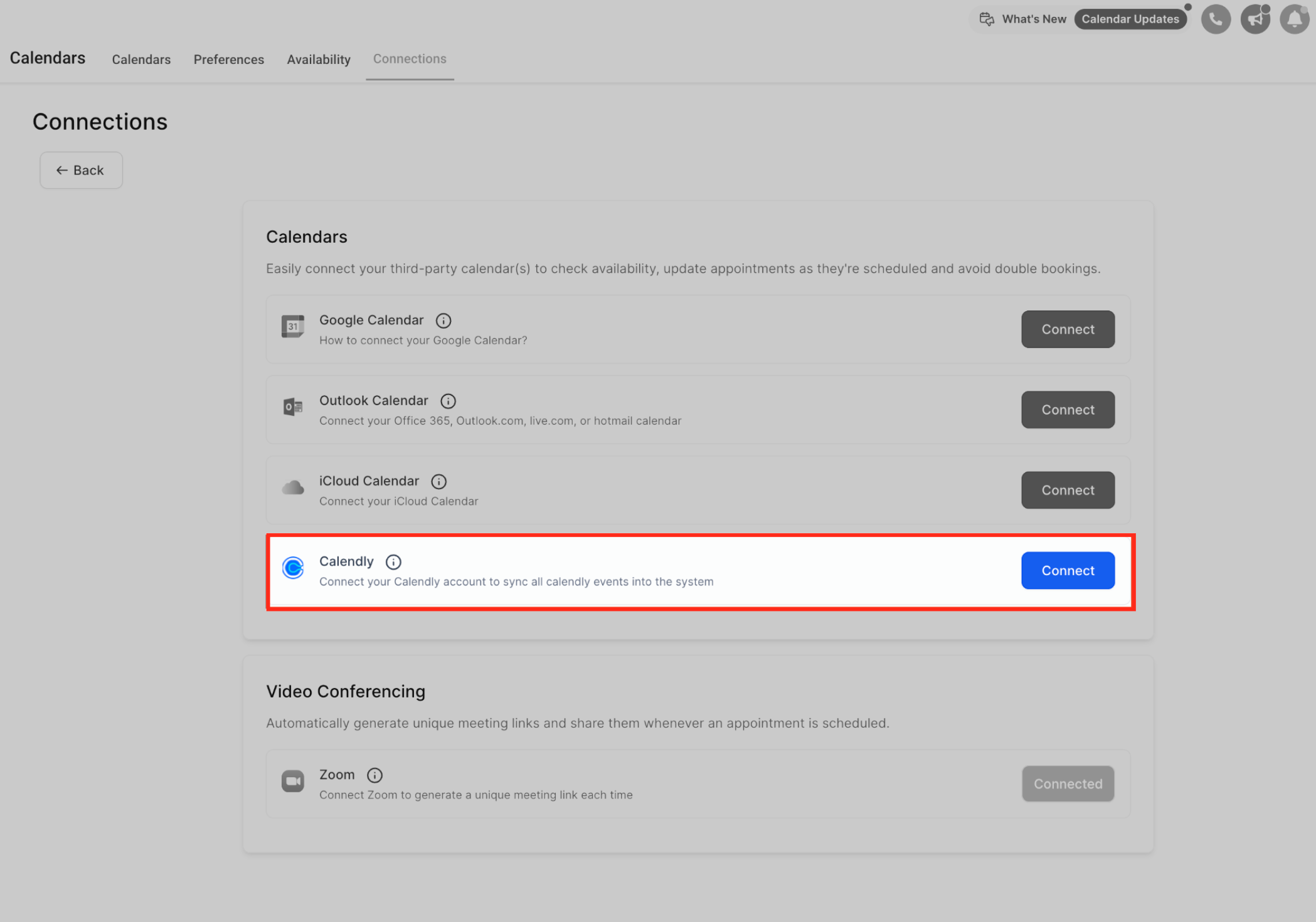 Click on the Connections tab at the top to view and manage all integrated calendar accounts. This is where you’ll add, edit, or remove third-party calendars like Calendly.