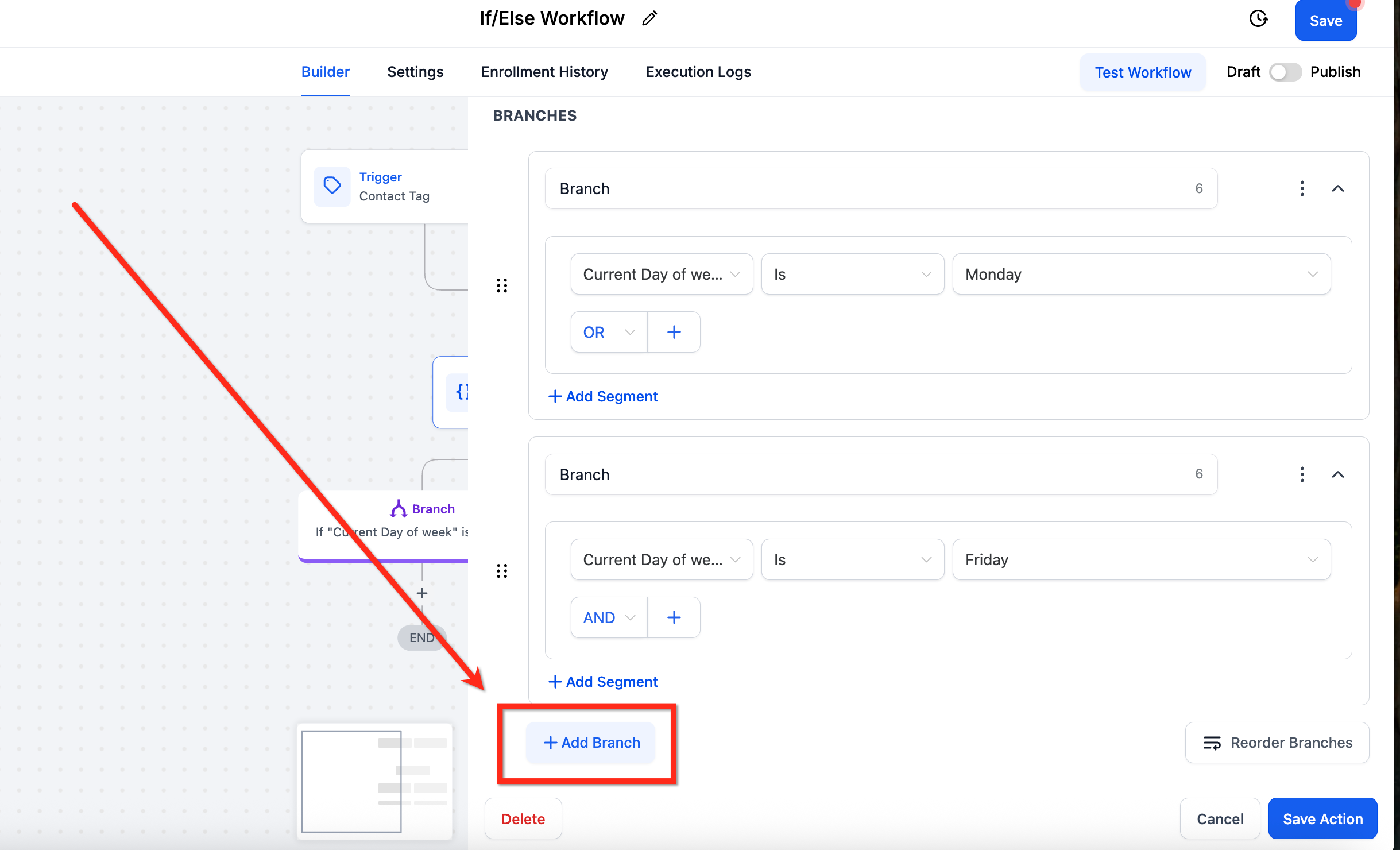 The If/Else action evaluates contact-specific data and splits a workflow into multiple branches based on whether conditions are met. Each branch represents a logical path that a contact follows depending on the outcome of the condition check.
