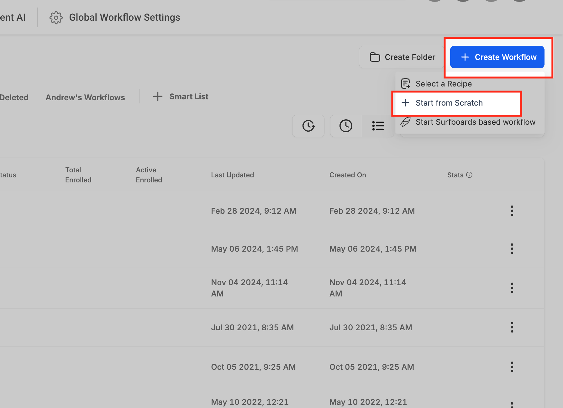 Click "+ Create Workflow" button at the top right and then " + Start from scratch"