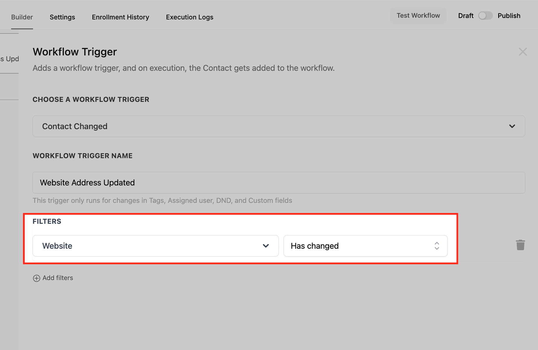 Yes! You can add multiple filters under the “Contact Changed” trigger to track different types of changes simultaneously. For example, you can configure the workflow to trigger when either a tag is added OR a custom field is updated, ensuring the automation responds to multiple events.