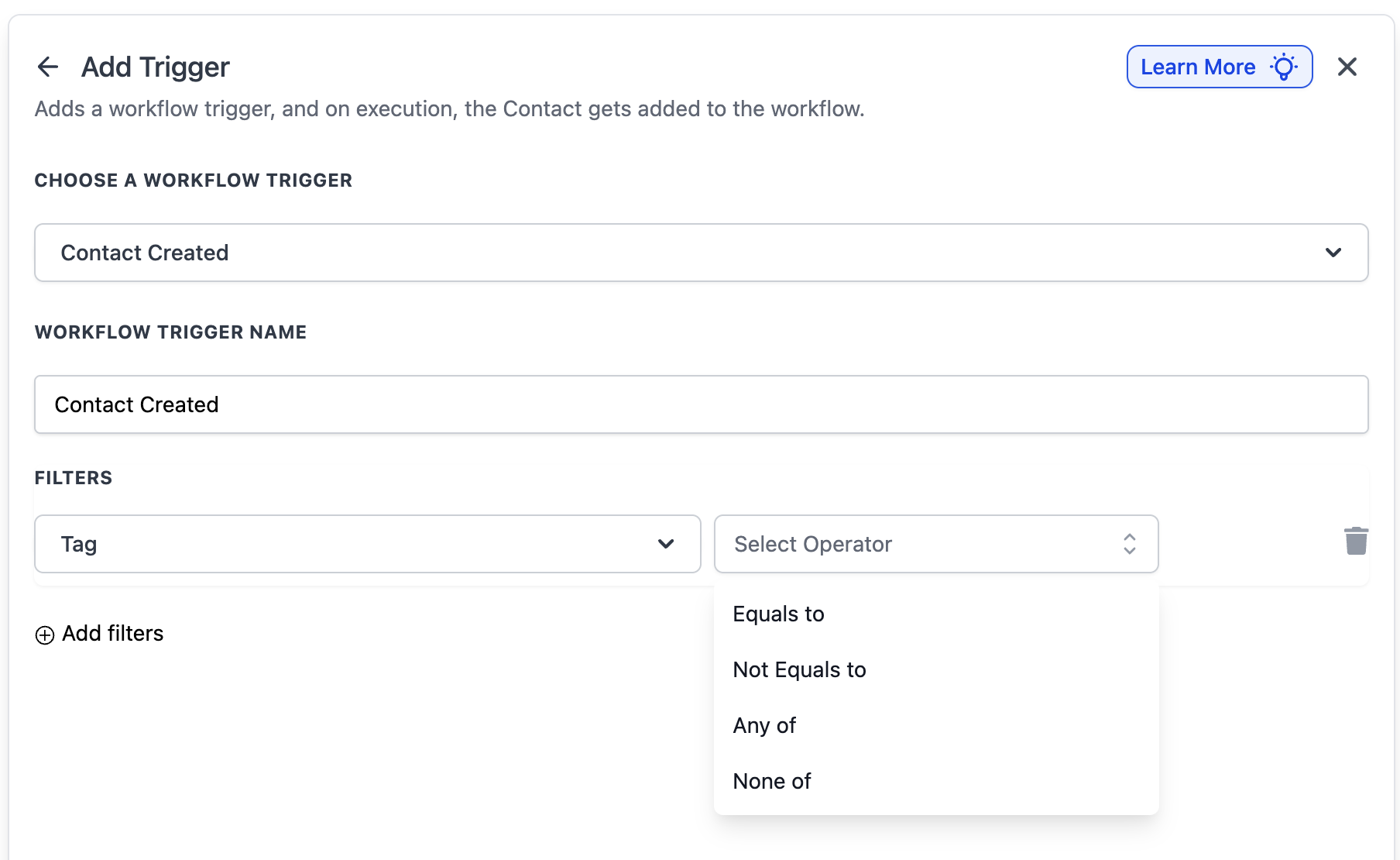 1. Tag: Use this filter to control which tagged contacts can enter the workflow.