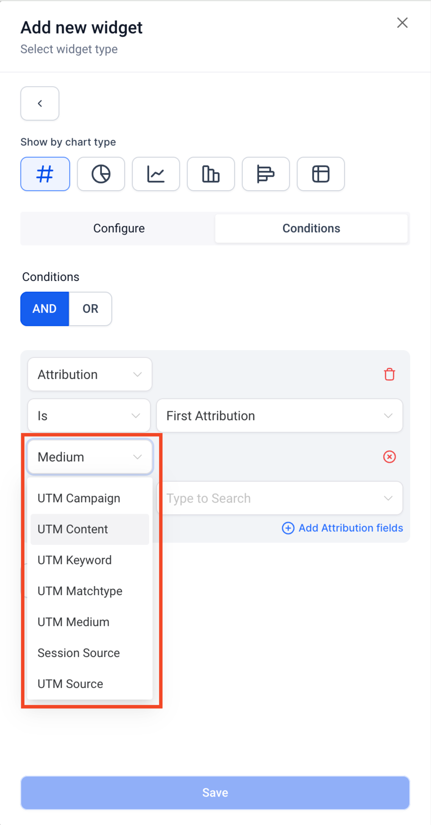 Important Note: 1. UTM parameters and fields will only be visible on Table and Granular insights view if Attribution type (First or Latest) is added in widget conditions 2. Group/View by properties - Session Source and Medium can only be selected if Attribution type (First or Latest) is added in widget conditions