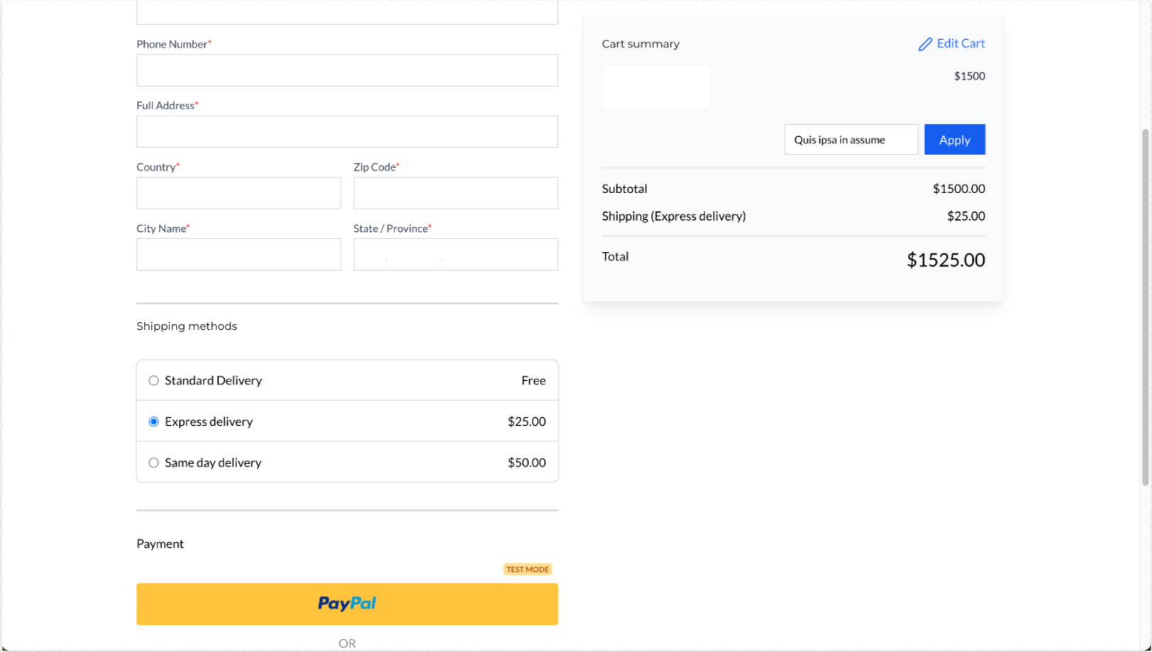 Once your zones and rates are configured, customers automatically see the available shipping options at checkout. The system applies the correct rate based on their address and cart details.