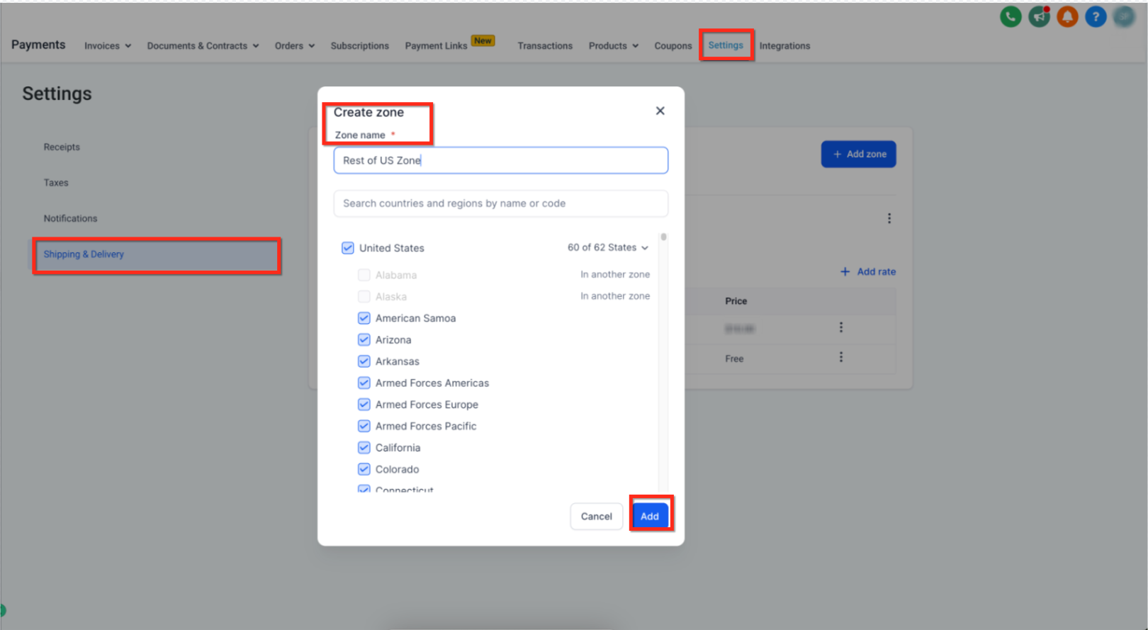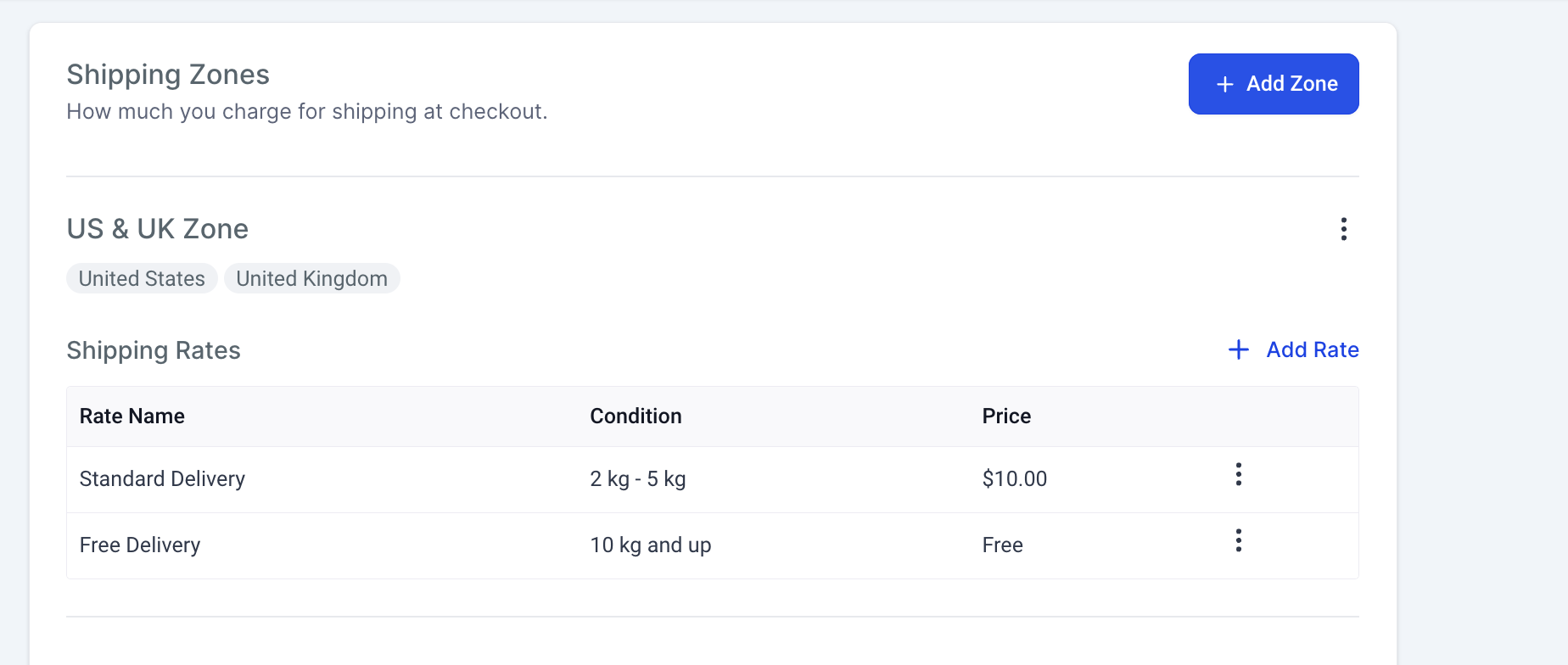 Shipping zones let store owners define delivery regions where shipping costs vary. For example, you can charge different rates for different states or regions within a country.