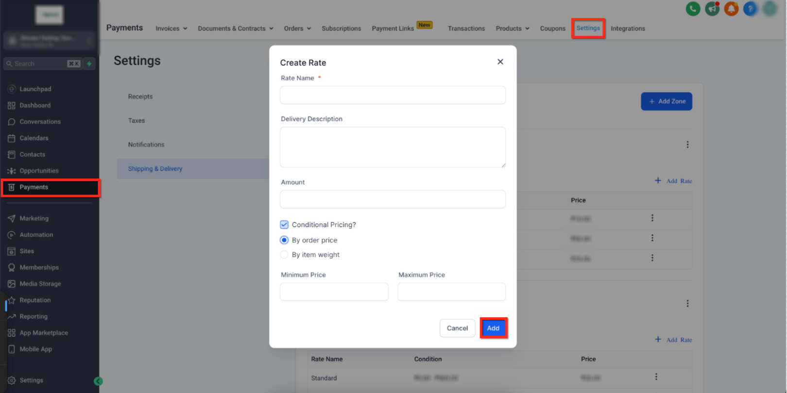 HighLevel allows ecommerce store owners to define manual delivery charges based on multiple criteria—such as shipping zones, states/provinces, and product weights. This feature gives merchants full control over how shipping is charged at checkout, ensuring fairness, flexibility, and accuracy.
