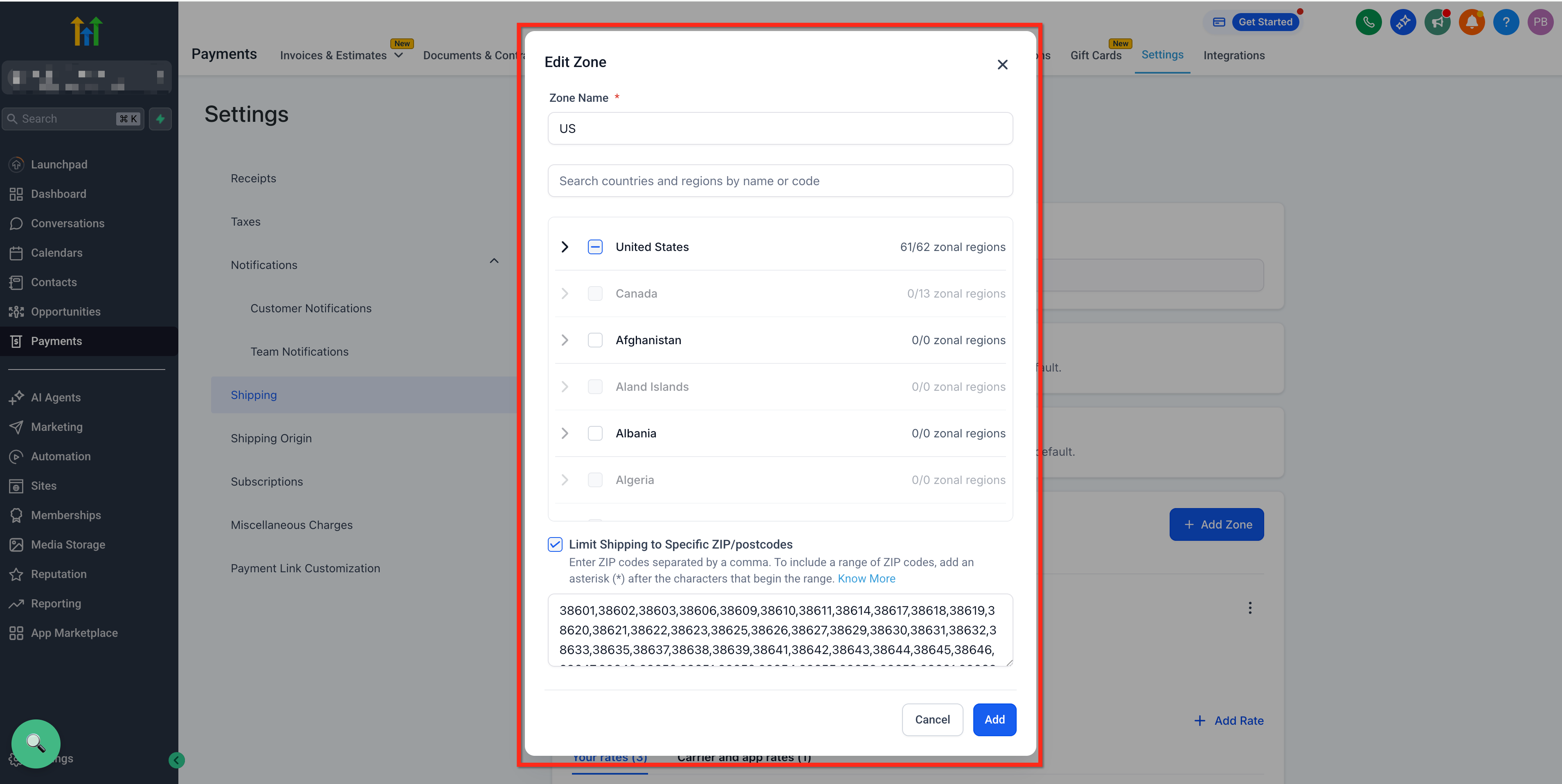 When creating or editing a shipping zone, you can restrict the zone so it only applies to specific ZIP/postcodes. This helps you support hyper-local deliveries or prevent shipping to certain areas by controlling where a zone applies.
