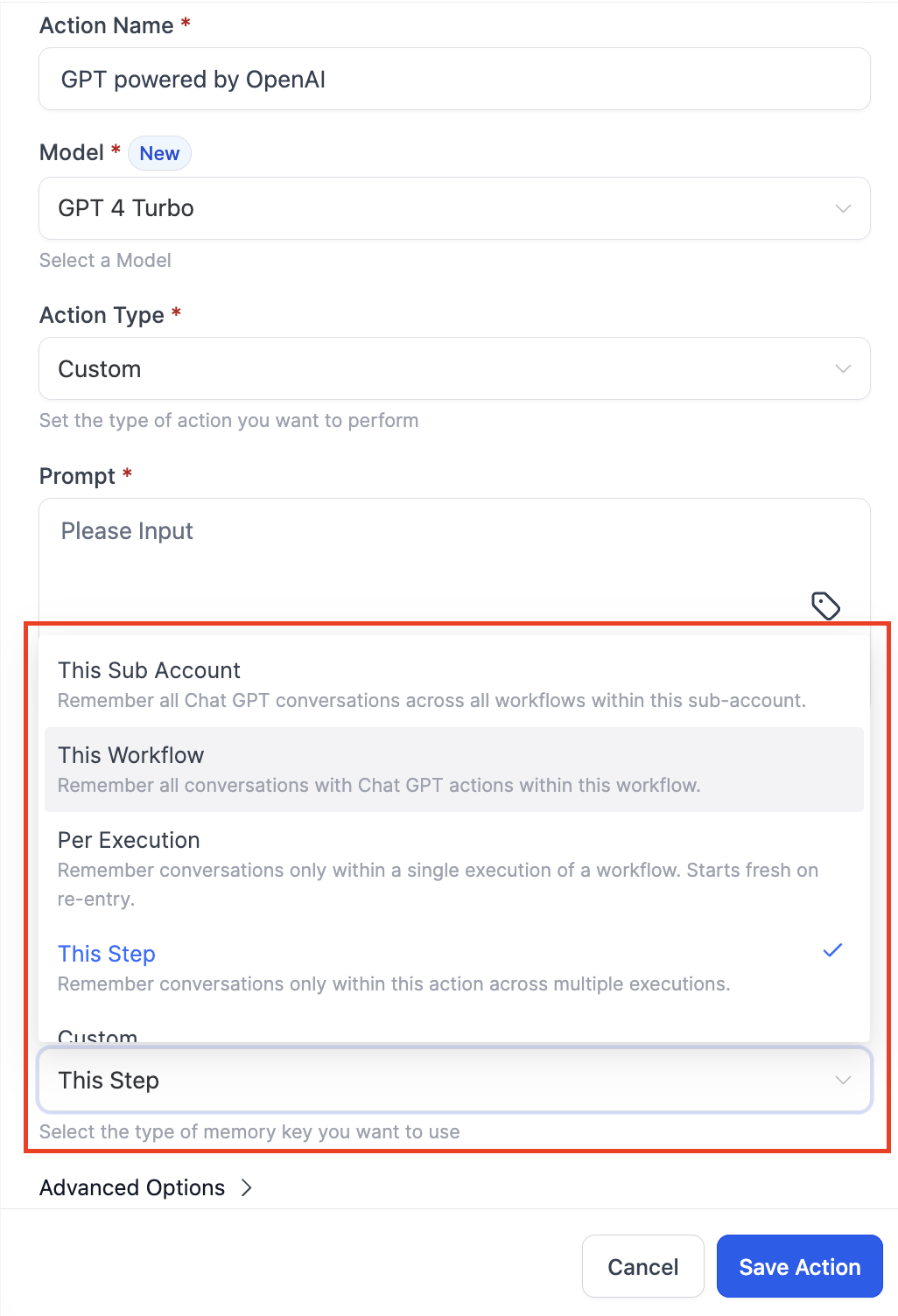 - This Sub Account - Remembers all GPT conversation across all workflows in the sub account where the History type is "This Sub Account"