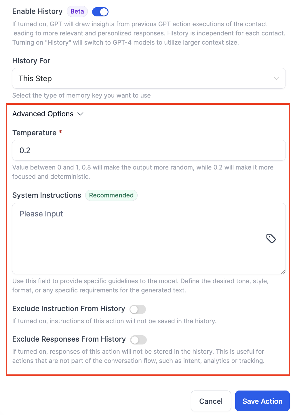 - This Step - Remembers all GPT conversation for the specific action across multiple executions where the History type is "This Step"