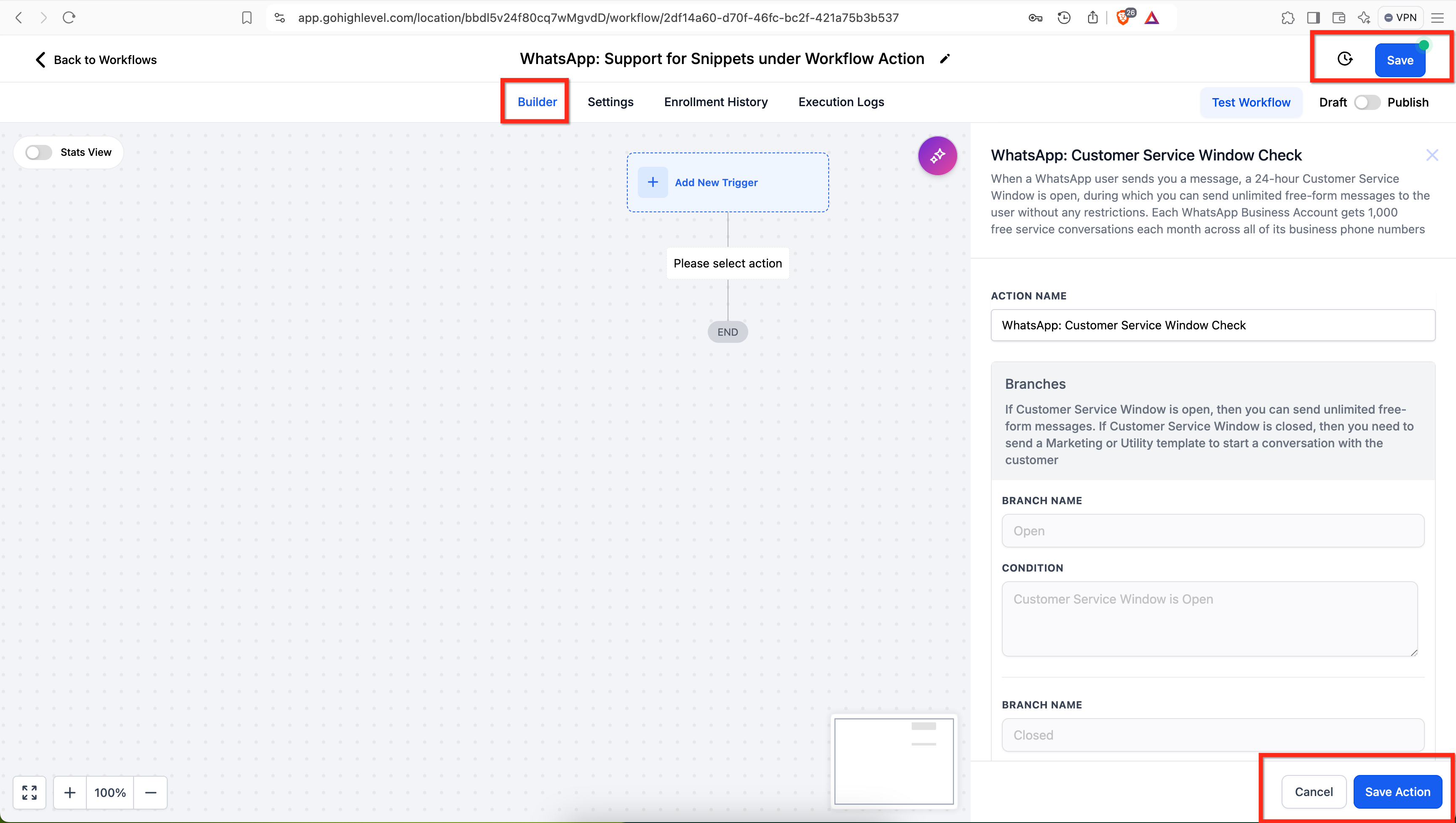 Add an initial trigger and then add action WhatsApp: Customer Service Window Check to confirm the contact is within the 24-hour window.