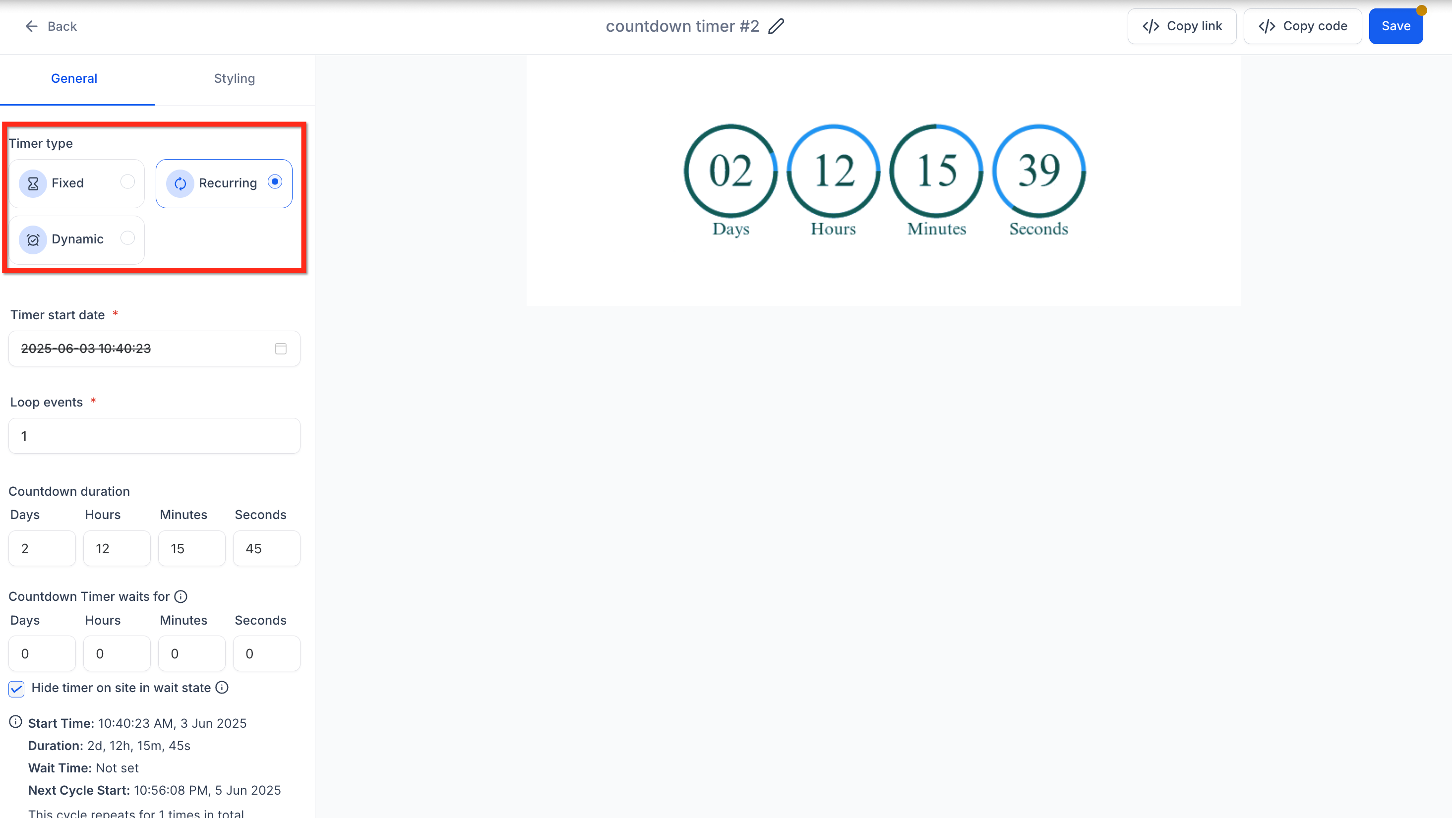A recurring timer is a useful tool for managing and promoting events, sales, or activities that happen regularly. Unlike a fixed timer, which counts down to a single event, a recurring timer resets after each cycle, providing ongoing reminders about repeating events or deadlines.