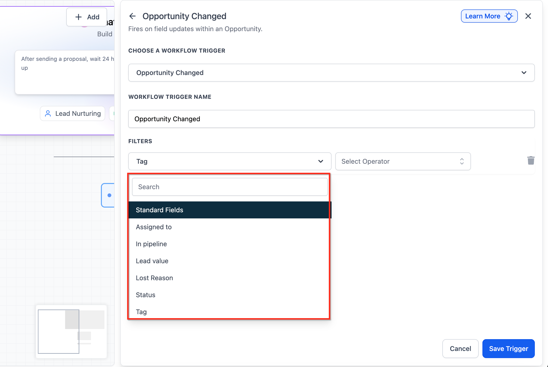 Click “ + Add New Trigger” and select Opportunity Status Changed from the dropdown menu.