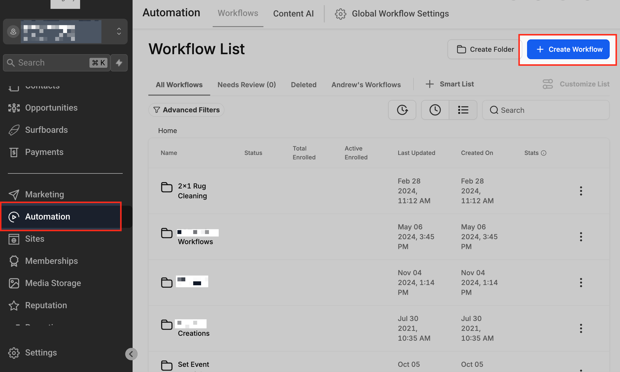 Select or create a workflow by navigating to the Automation section. Create a new workflow or choose an existing one where you want to add the Math Operation action.