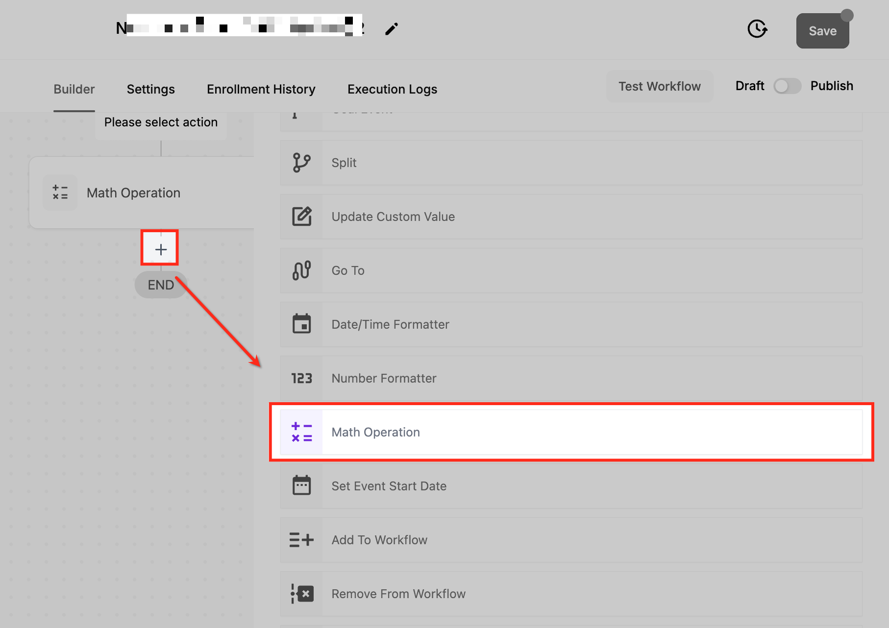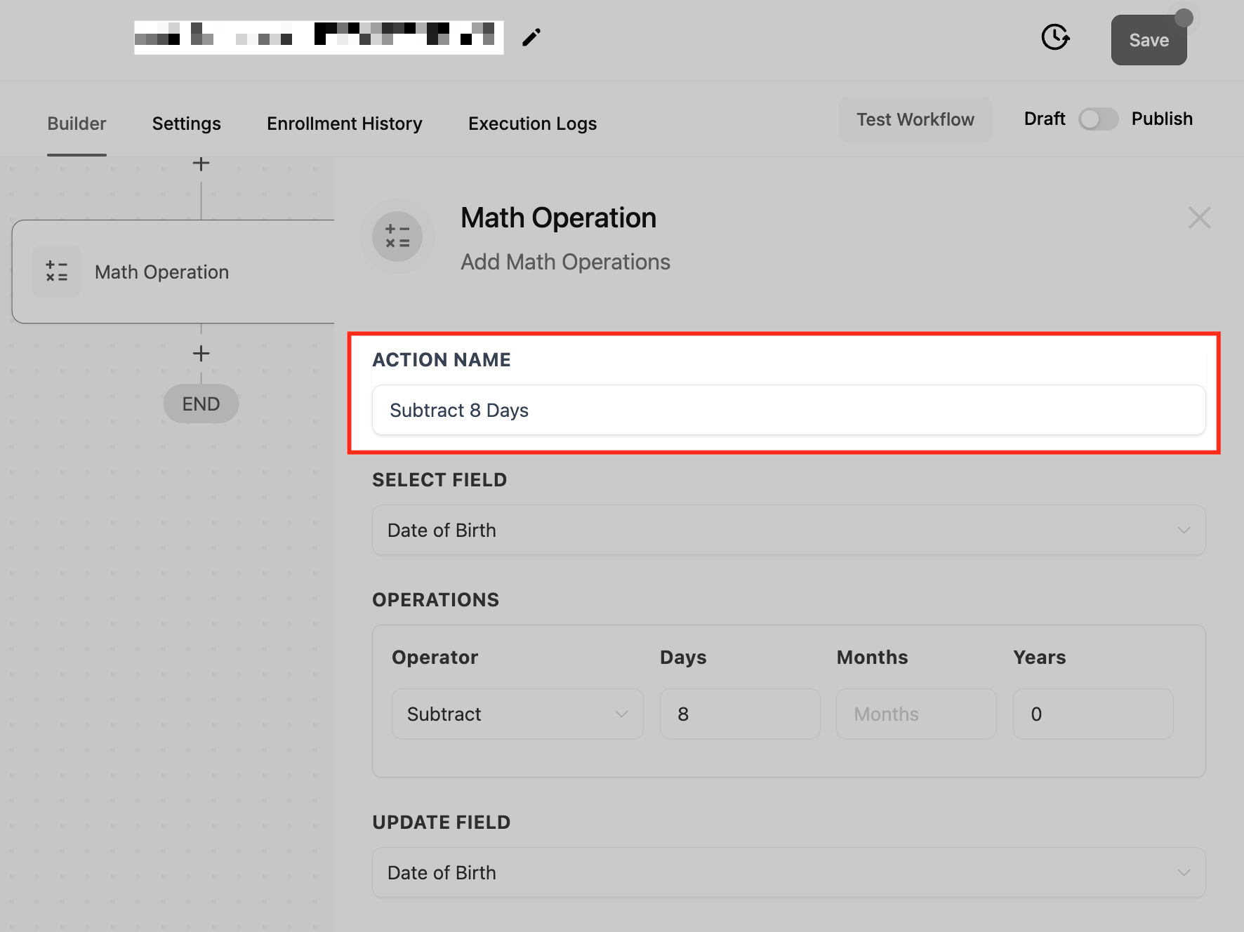 Save and activate the action by clicking “Save” to apply the Math Operation action to the workflow. Once your workflow setup is complete, click “Publish” to activate the workflow.