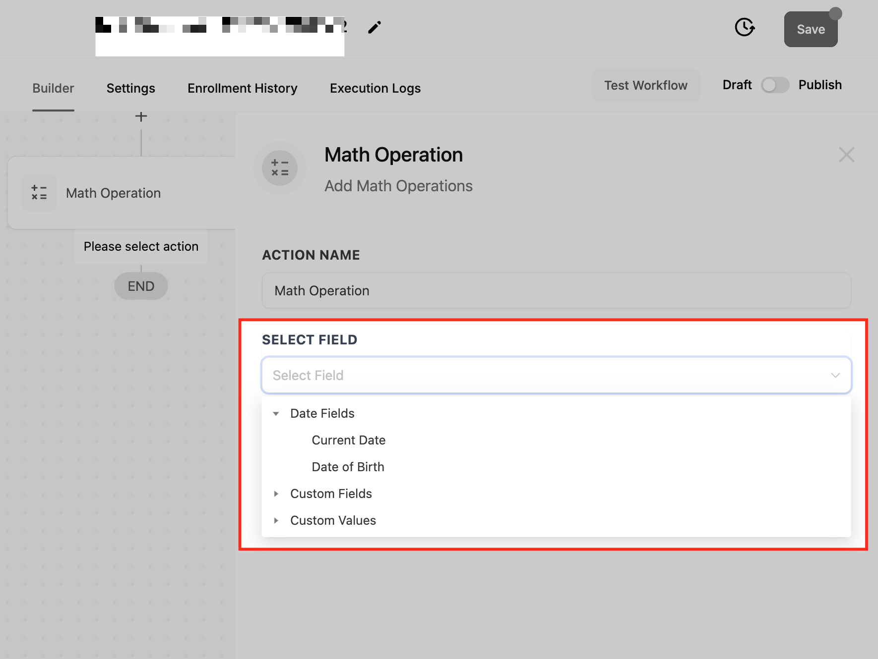 - Custom Values: This option allows you to manually input a static value instead of selecting a stored field. It’s useful for applying fixed calculations, such as adding a specific number of days to a date field or calculating a percentage increase for lead scores or pricing adjustments.