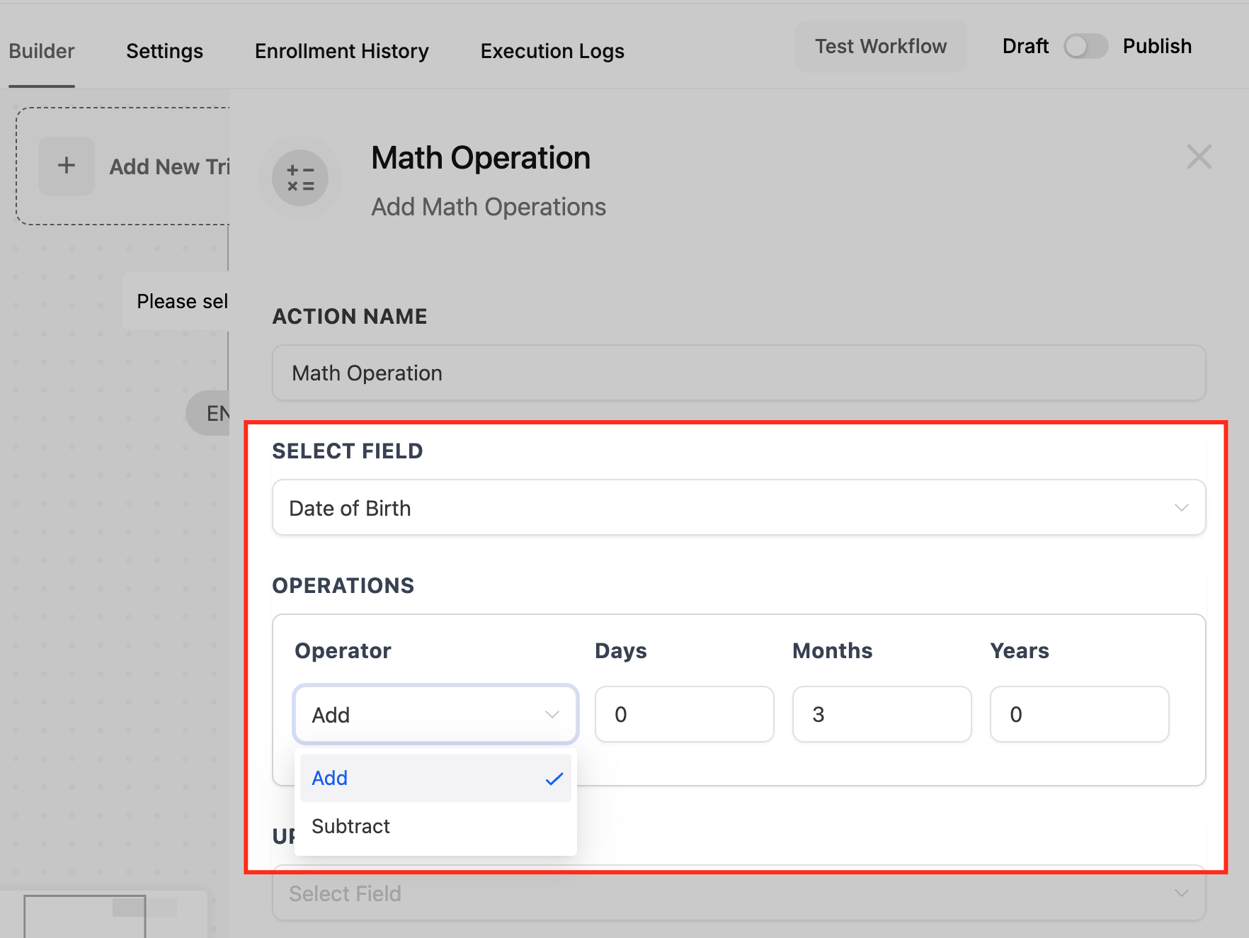 The Math Operation workflow action allows users to perform various calculations directly within a workflow. You can add, subtract, multiply, or divide numeric fields and update them automatically based on specific actions or triggers. For date fields, you can add or subtract days, months, or years, making it easy to automate time-sensitive processes like reminders or scheduling.