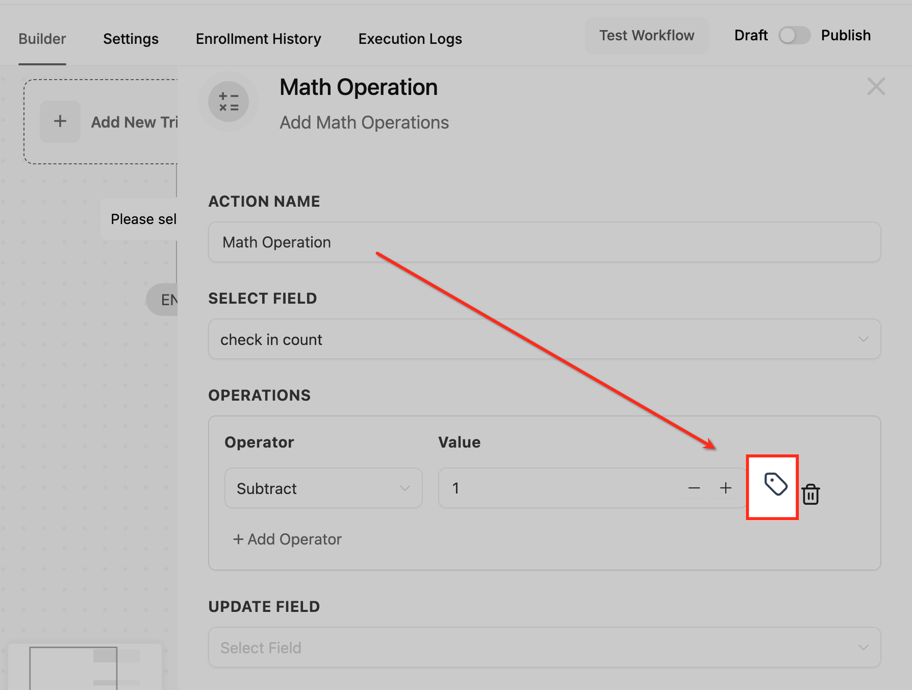 The Tag Icon allows you to select dynamic values from custom fields instead of entering static numbers manually. This ensures that calculations automatically adapt to real-time data changes, making workflows more flexible and efficient.
