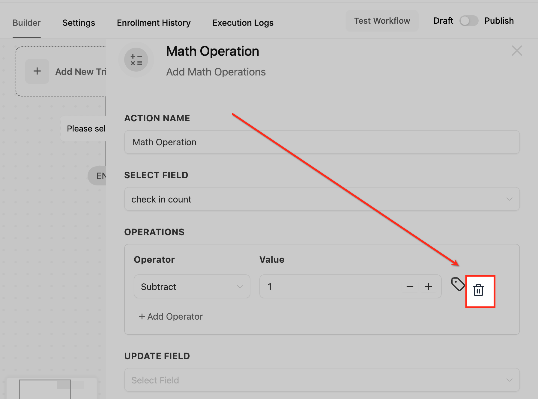 The delete icon (trash bin) lets you remove an operation if you no longer need it. This feature helps keep calculations clean and accurate by allowing quick adjustments without rebuilding the entire Math Operation action. If a mistake is made or an operation is no longer required, simply click the trash bin to delete it.
