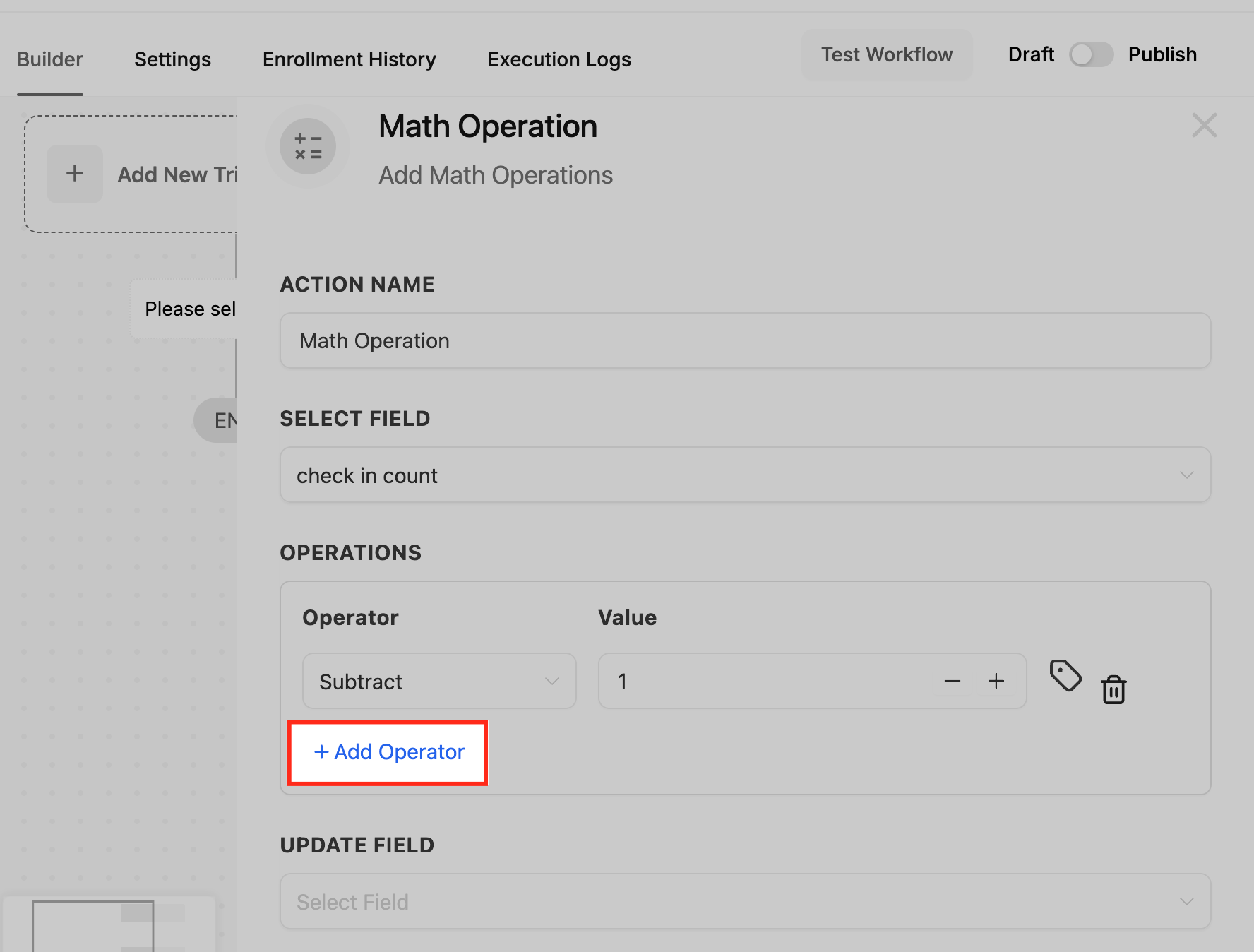 In order to add multiple math operations within a single math operation action you will use the Add Operator option. This feature is useful when performing a sequence of calculations, such as first adding a value and then multiplying the result. By clicking Add Operator, you can continue refining the calculations without needing separate workflow actions, making complex automation setups more efficient.