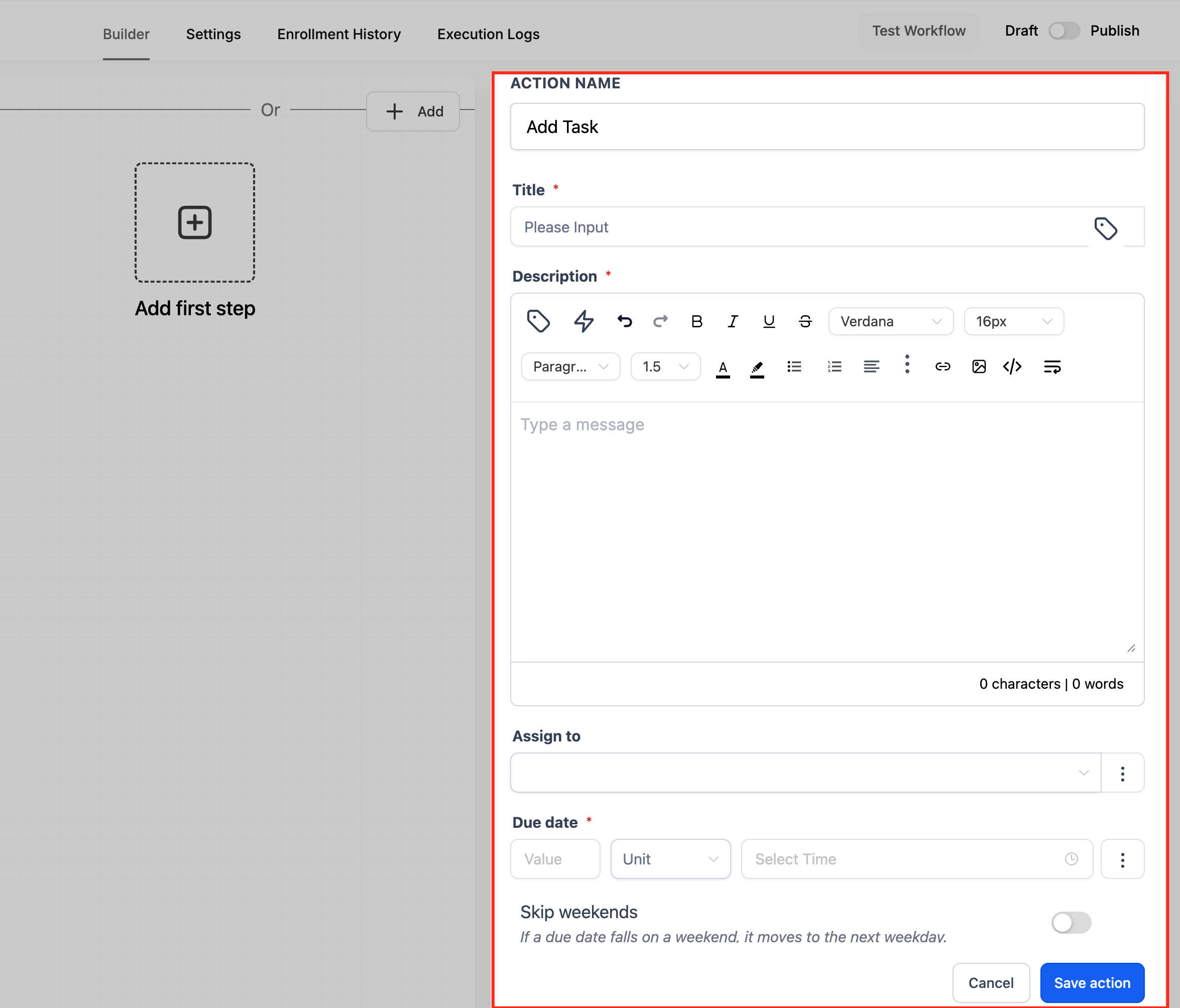 - Action Name: Give the action a clear name (for example, “Add Task - Follow Up”).