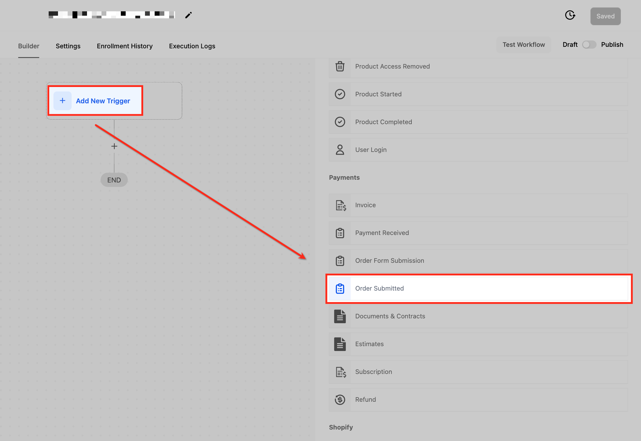 Once inside the workflow builder, click on Add New Trigger to begin setting up your automation. In the search bar, type Order Submitted and select it from the list of available triggers.After selecting the trigger, you’ll have the option to customize it further by applying filters based on product type, order source, or submission details.