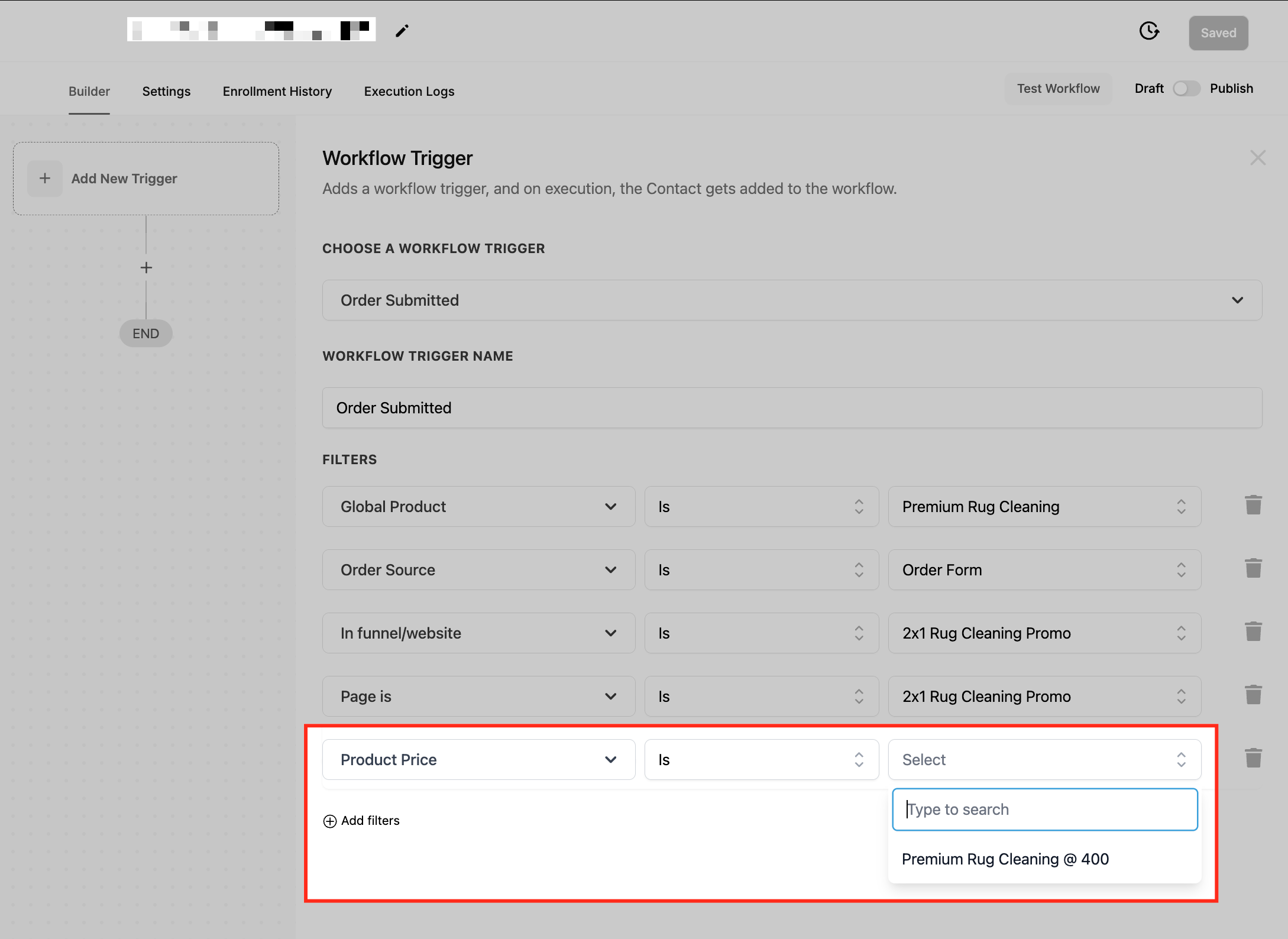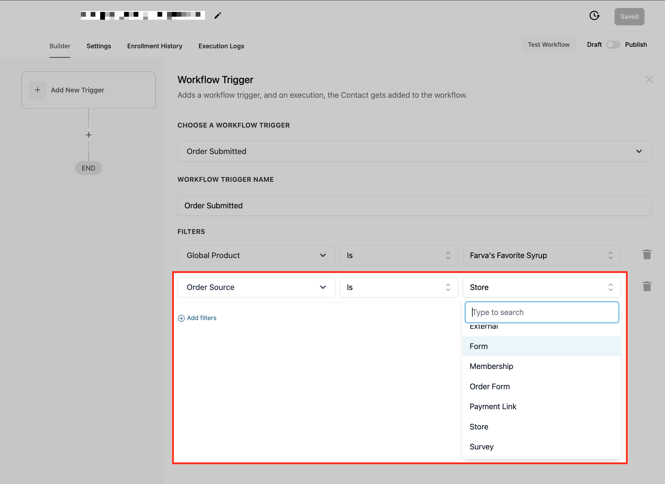 This filter ensures that workflows trigger only when an order form is submitted through a specific funnel or website, helping businesses refine automation based on the exact sales channel used. This is particularly useful for businesses that run multiple sales funnels or have different websites for various products or services.