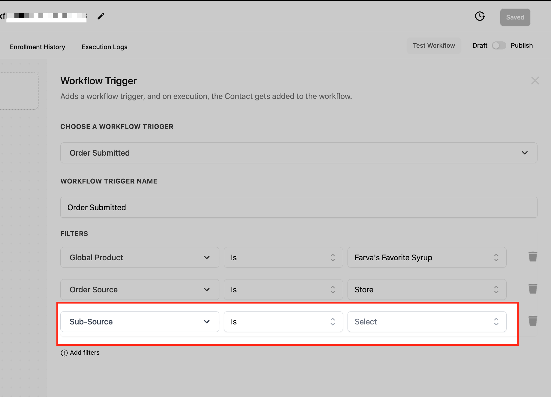 This filter allows for a more granular refinement of the Order Source, helping businesses target specific funnels, pages, or other subcategories within the selected source. It ensures that workflows trigger only when an order is placed within a particular sub-environment of the main order source.