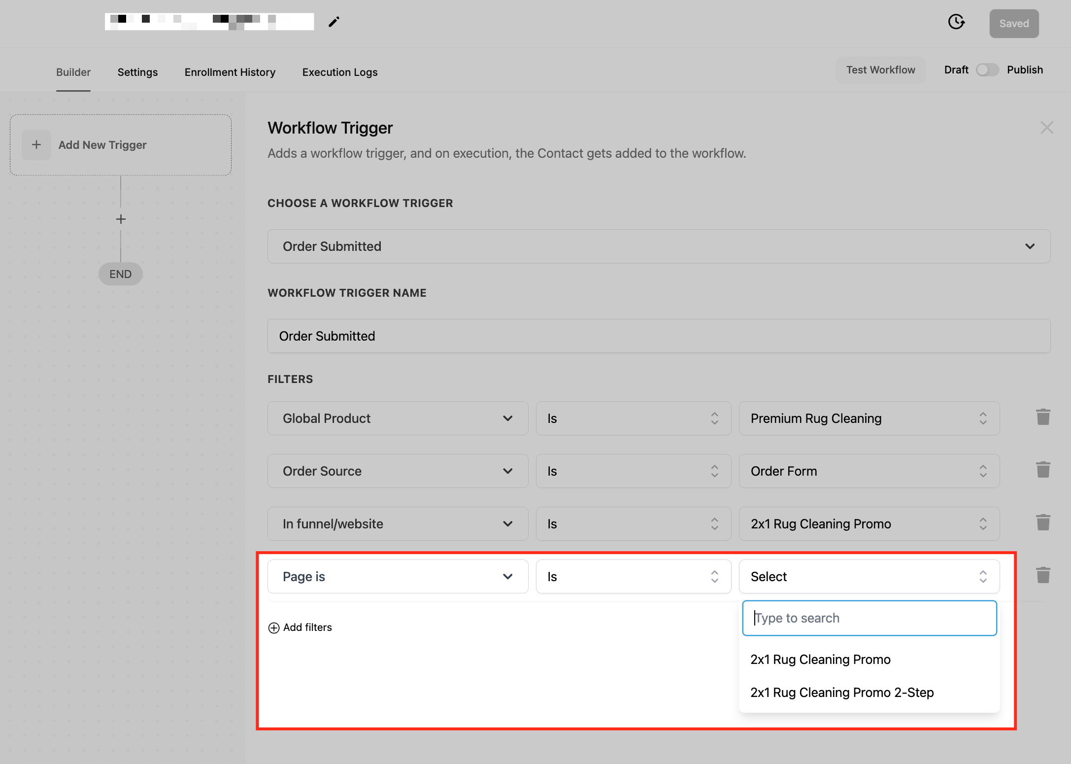 This filter ensures that workflows trigger only when an order form is submitted on a specific page within a funnel or website. It allows businesses to create highly targeted automation based on the exact page where a customer completes a purchase.