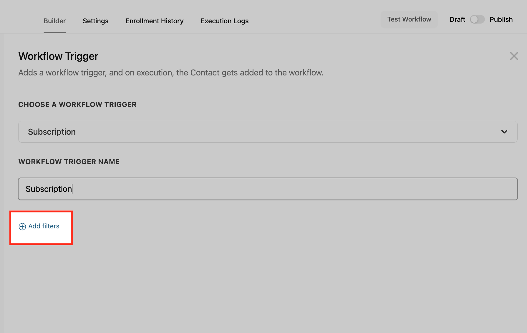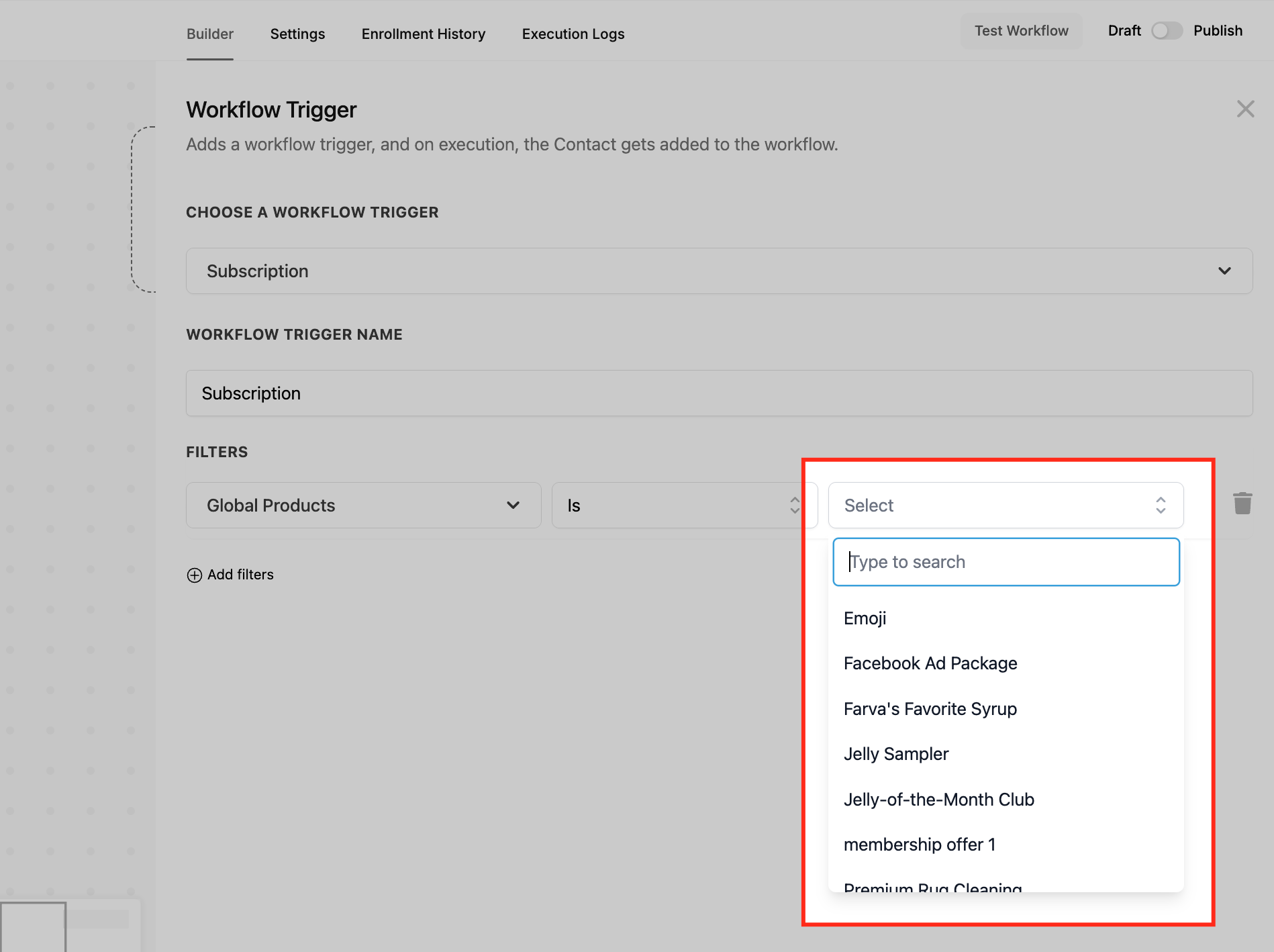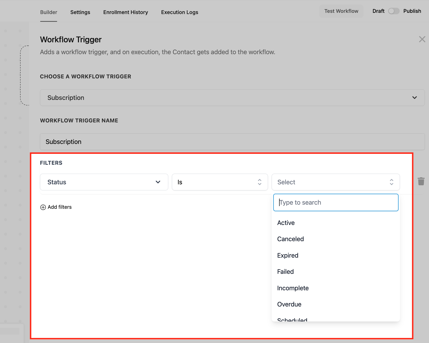 Use the Add filters option to apply conditions that narrow down which subscriptions should trigger the workflow. Filters help you specify criteria such as the product purchased or the status of the subscription (e.g., active, failed, trial). This is useful when you want the workflow to run only under certain circumstances rather than for all subscriptions.