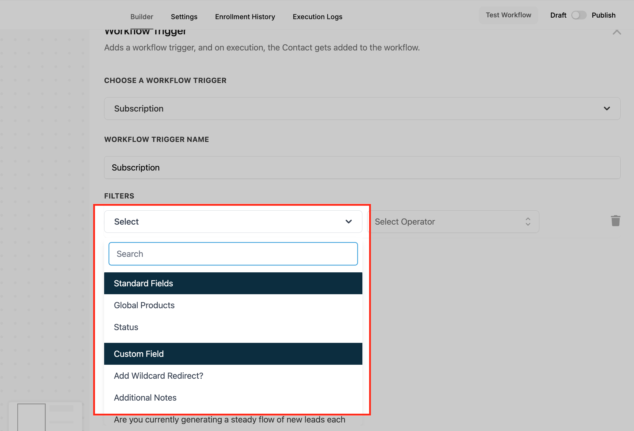 - Standard Fields: These are built-in options such as Global Products (the product associated with the subscription) and Status (e.g., Active, Expired, Failed). Filtering by these fields ensures that the workflow only runs when specific system-level conditions are met.