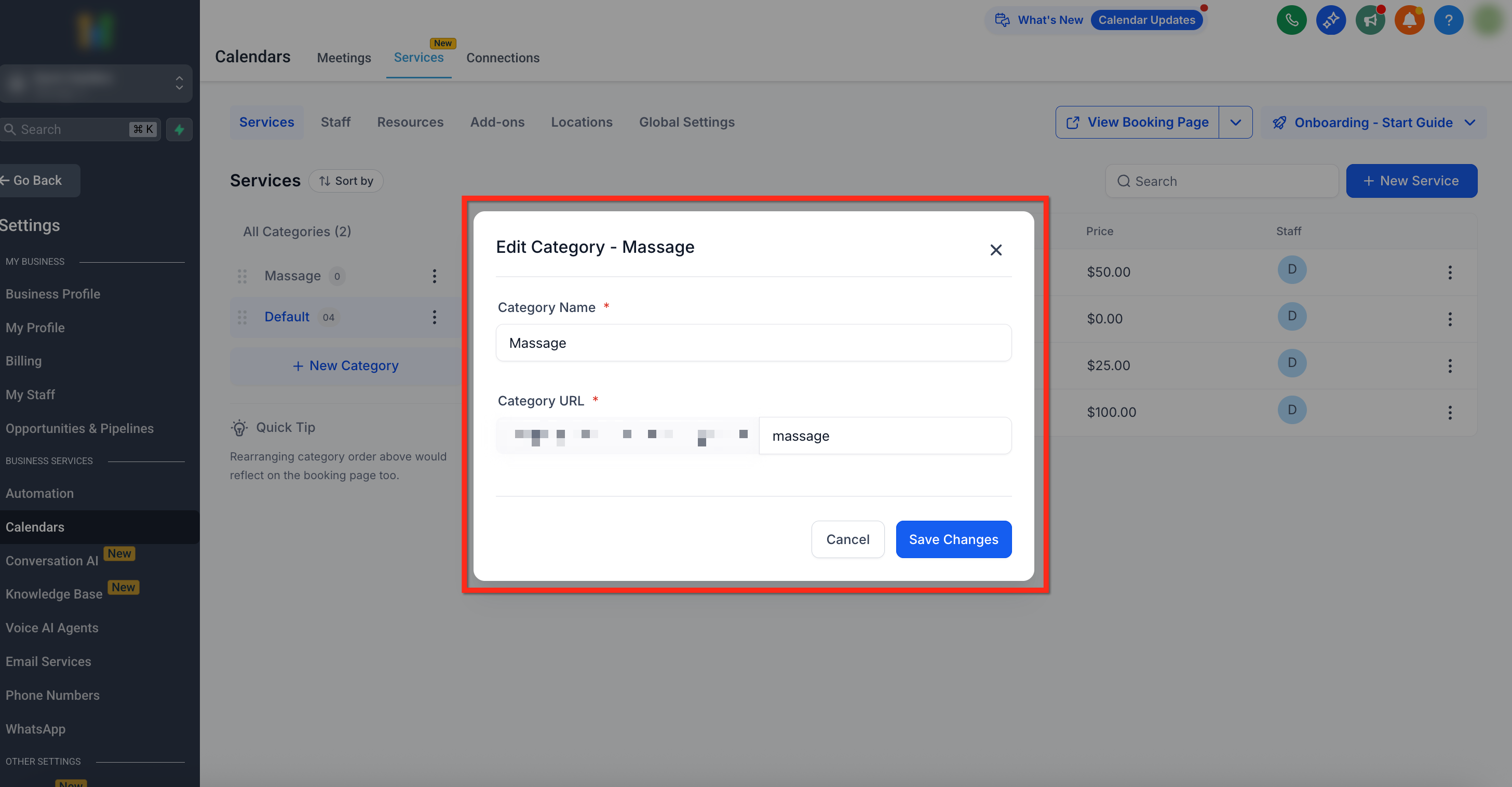 Place each service under the right category so it appears in the correct section on your public booking page. Unassigned services live in the Default Category, and services from a deleted category are moved there automatically. You can reassign them whenever needed.