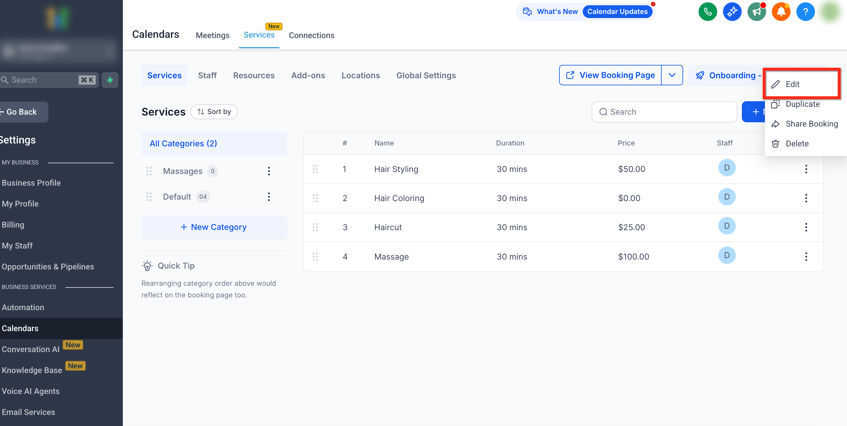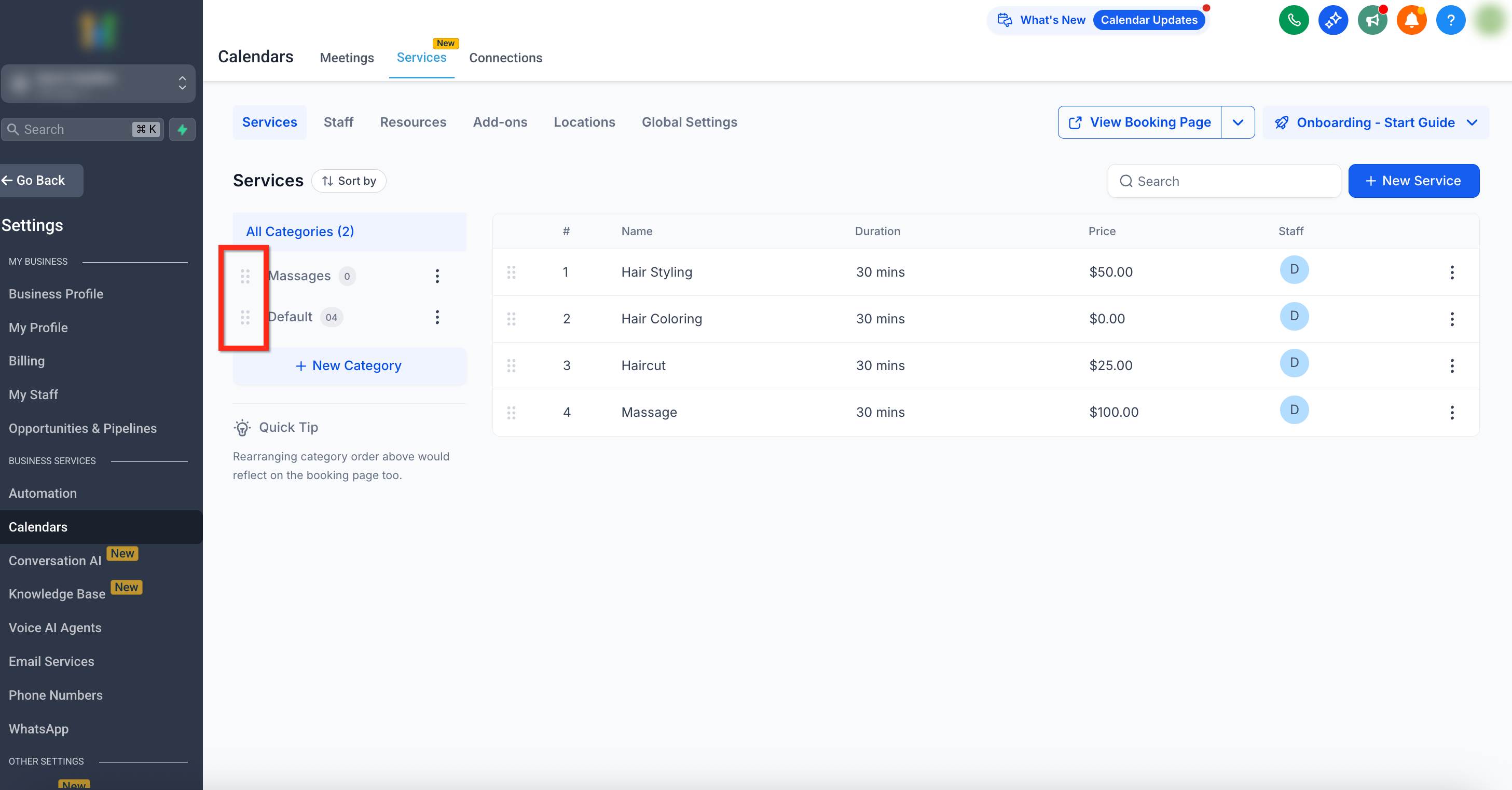 - If a category is deleted, all its services will be moved into the Default Category to ensure they remain bookable.