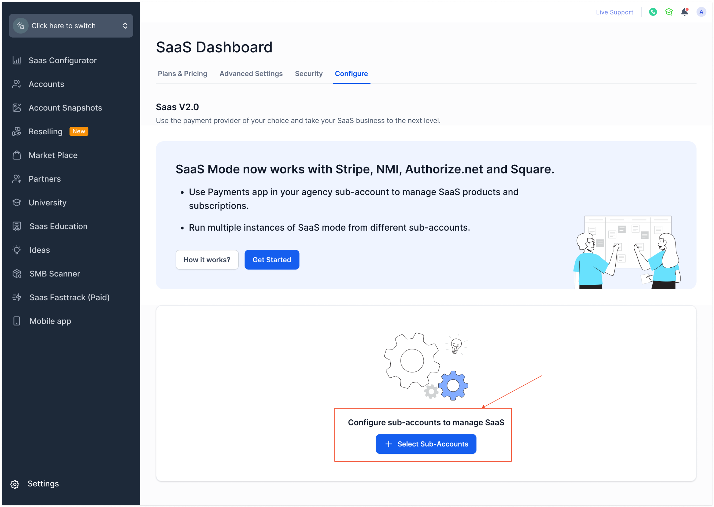 - At the agency level, in SaaS Configurator > Configure tab, click on 'Select Sub-Accounts'.