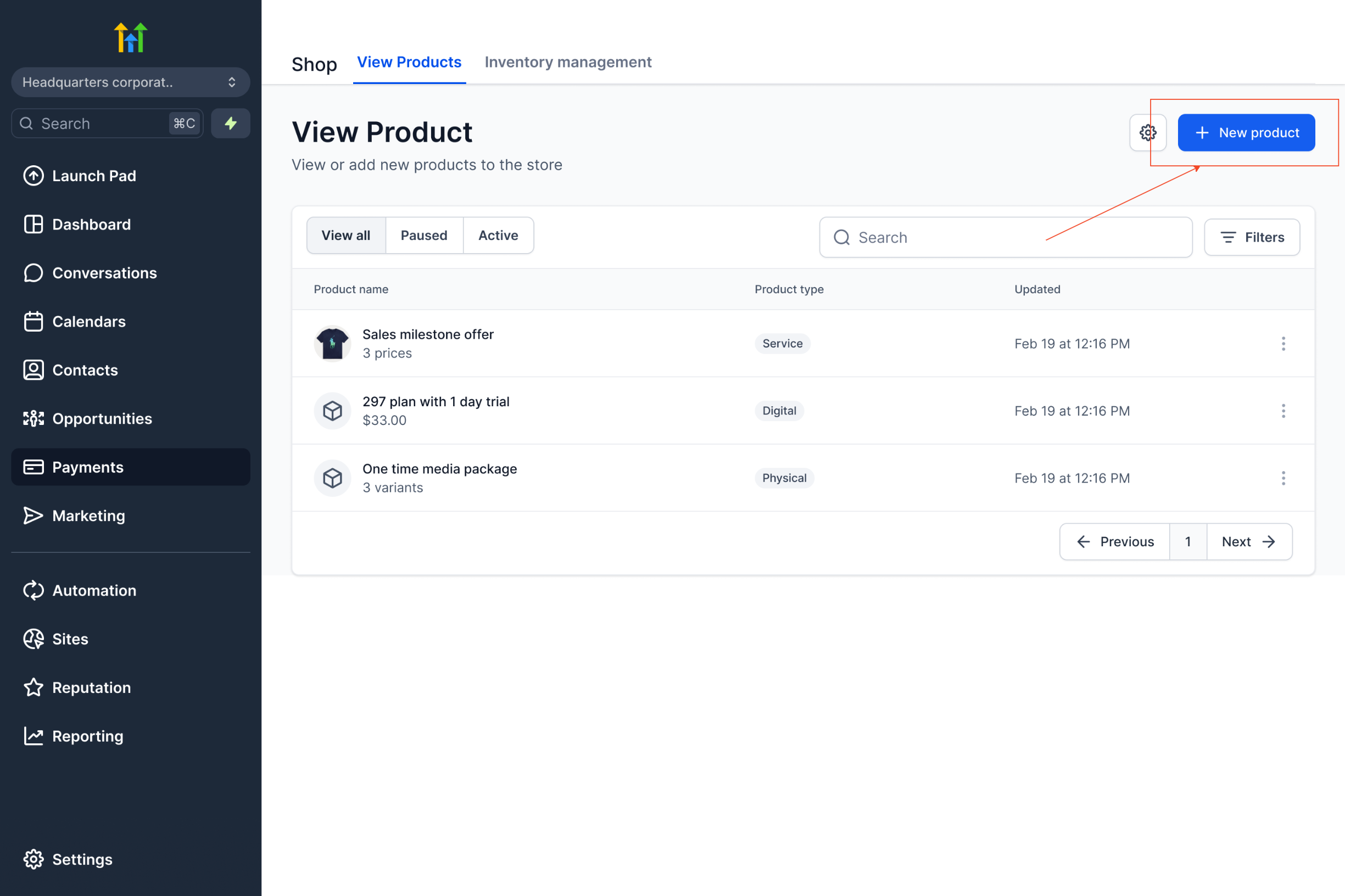 - Select the location (sub-account, from the list of your configured agency sub-accounts) where you need to create the product i.e. the one you'll be using to manage the customers and subscriptions, and process payments.