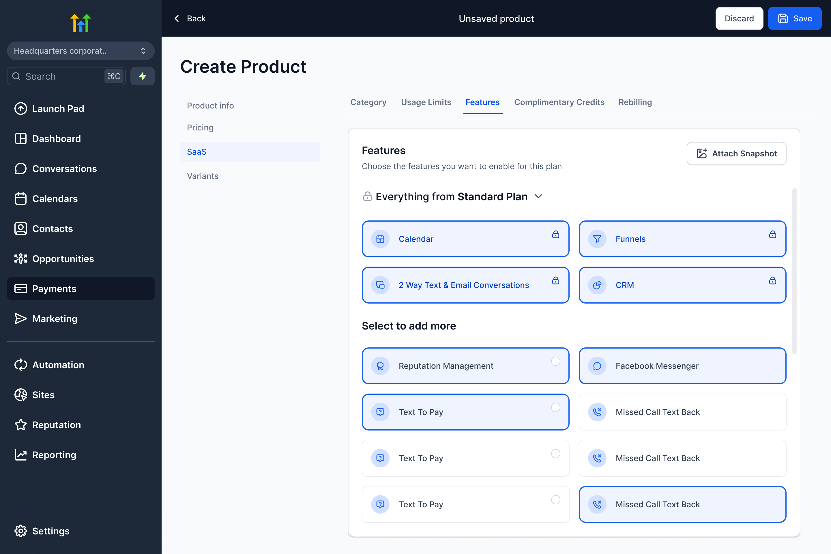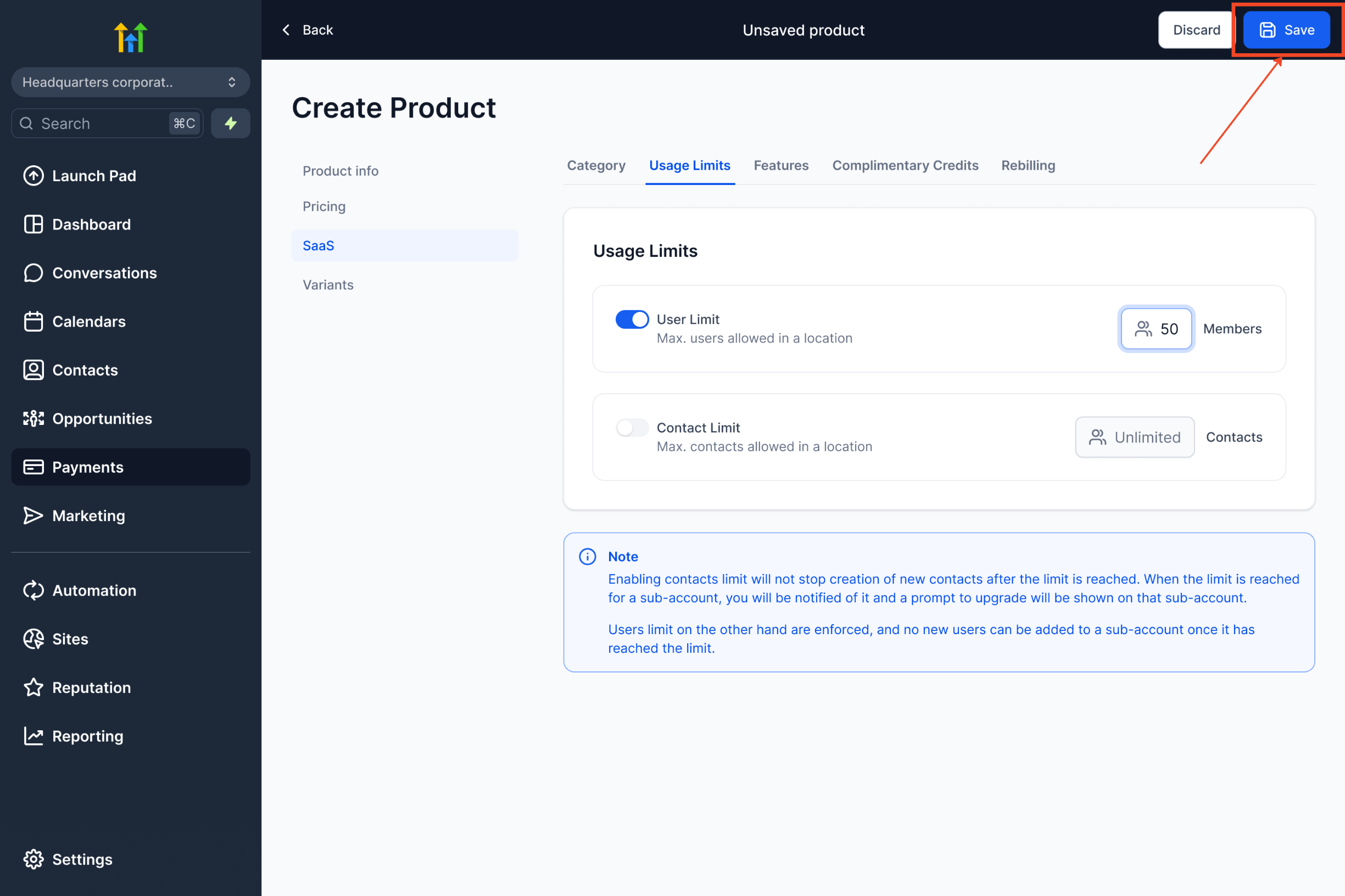 - Scroll to the SaaSsection to configure all the SaaS options including Features, Usage Limits, Complimentary Credits, Rebilling, Reselling etc.