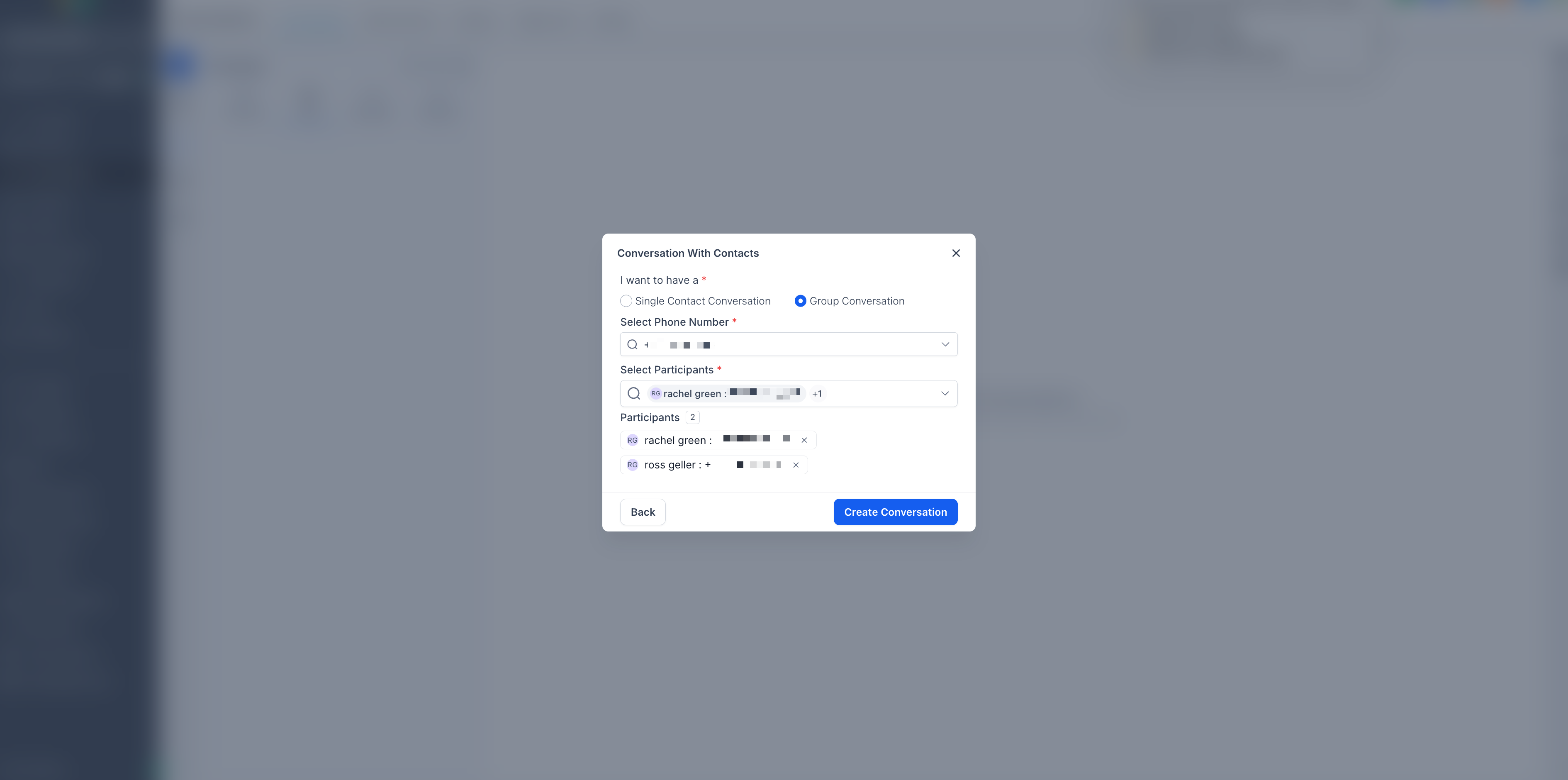 4. Select Group Conversation, choose your number to send messages from, add 2–9 participants, then click Create Conversation.