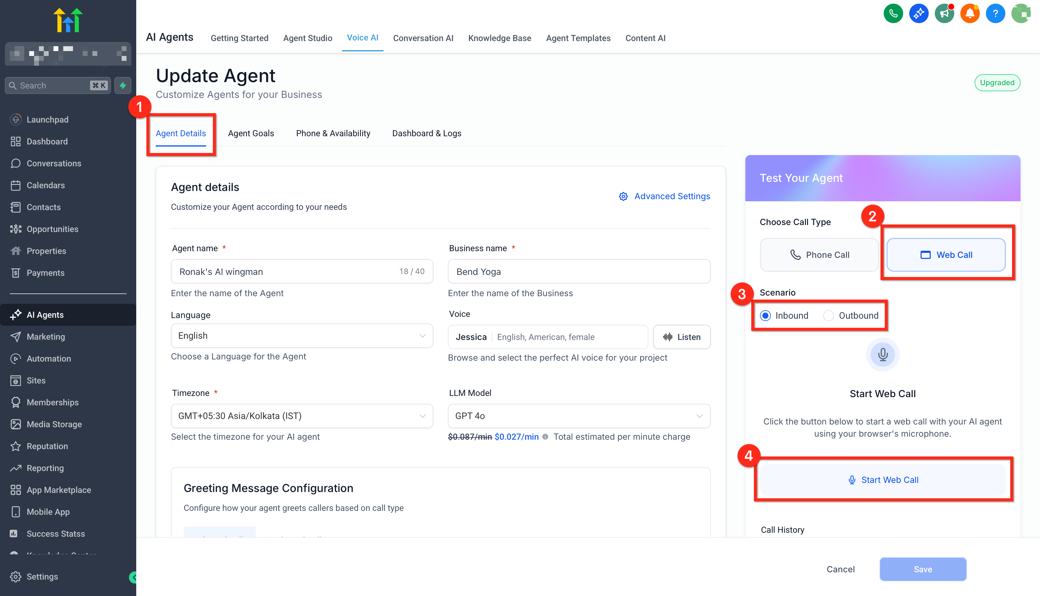 - On the Right side Test Your Agent panel click on Web Call and choose your Scenario (Inbound or Outbound). Then click on Start Web Call.