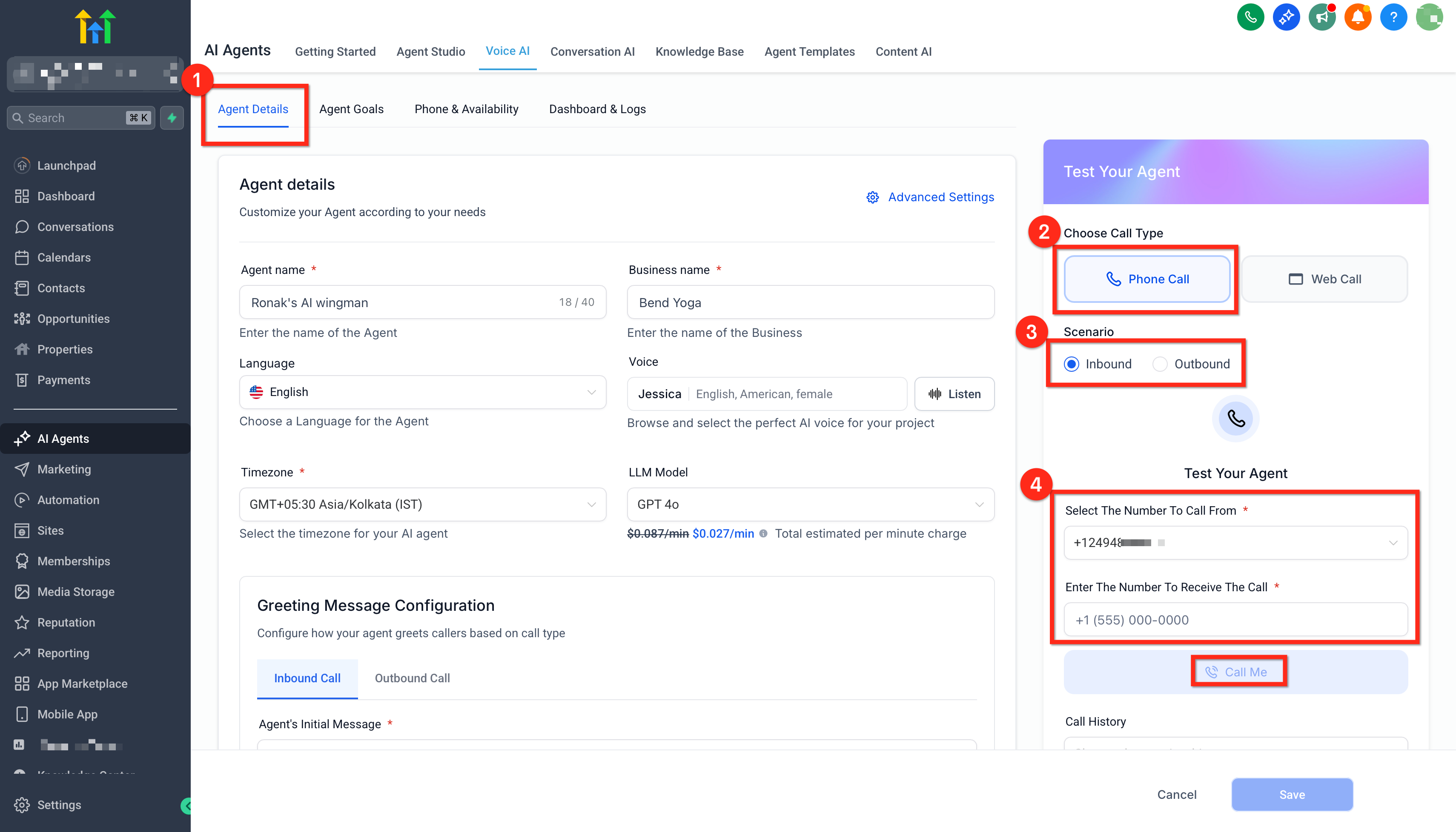 - Open AI agents from the left sidebar and Click on Voice AI in the top navigation ribbon