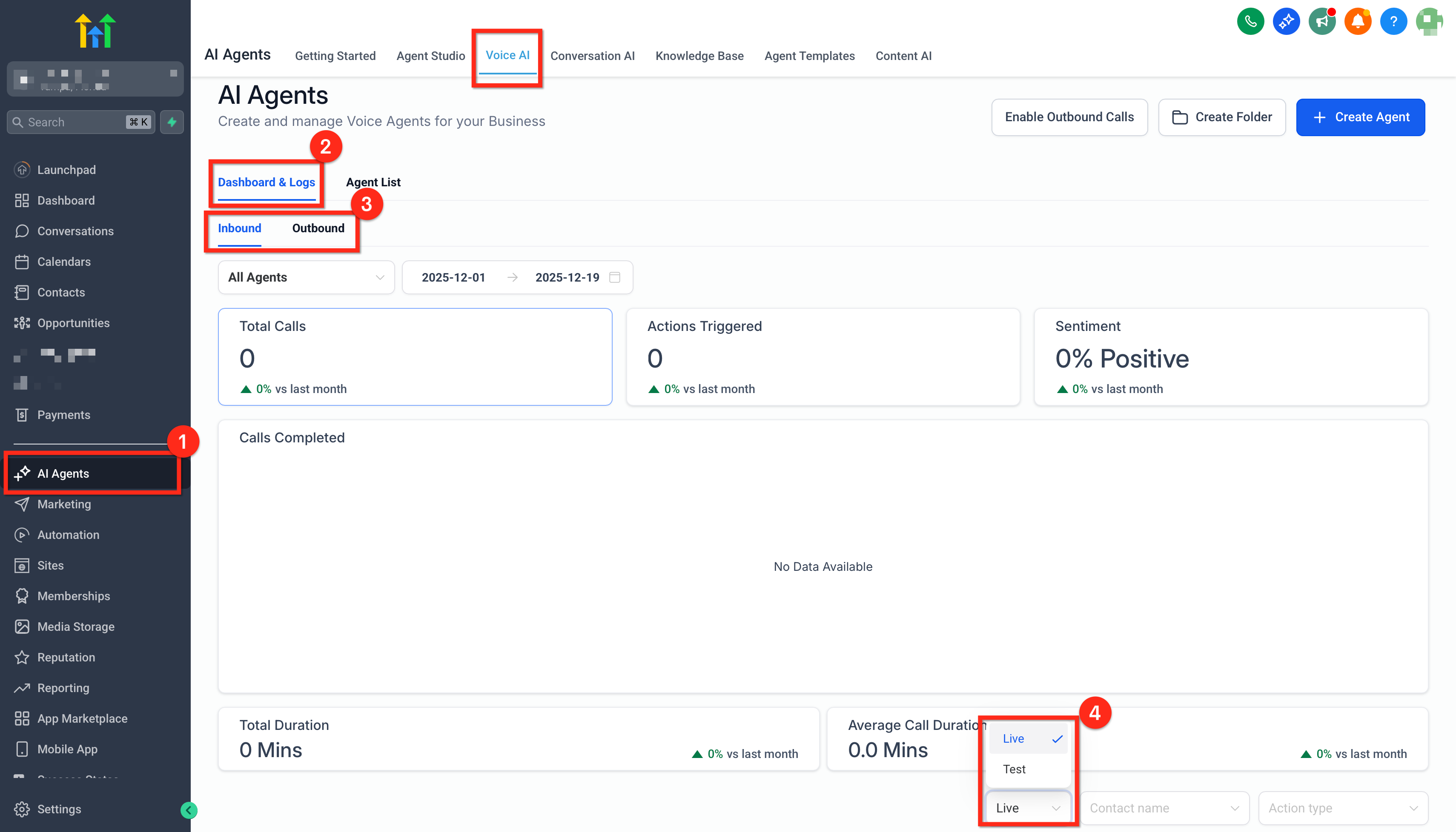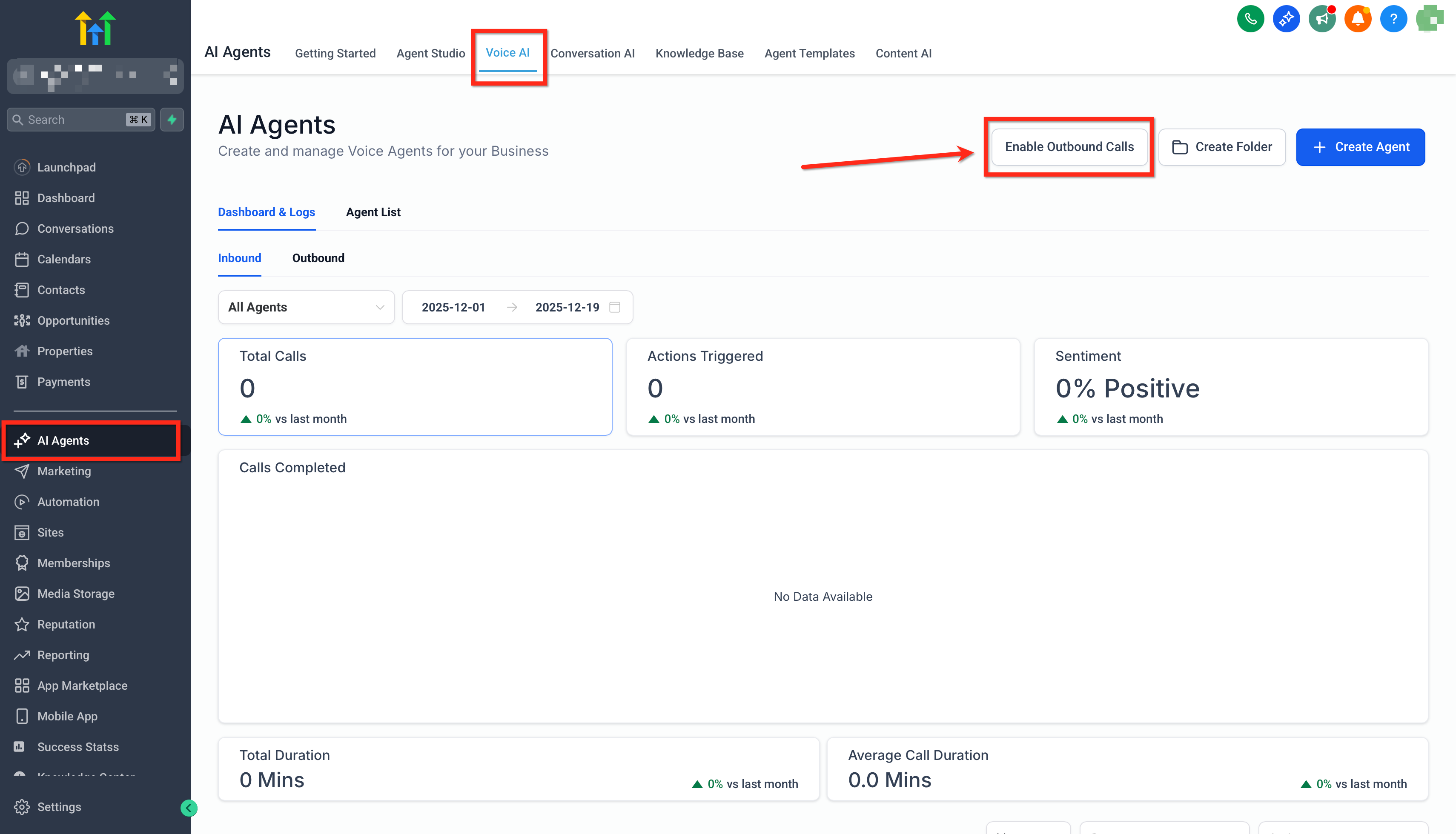 Open AI Agents from the left sidebar and Click on Voice AI in the top navigation ribbon