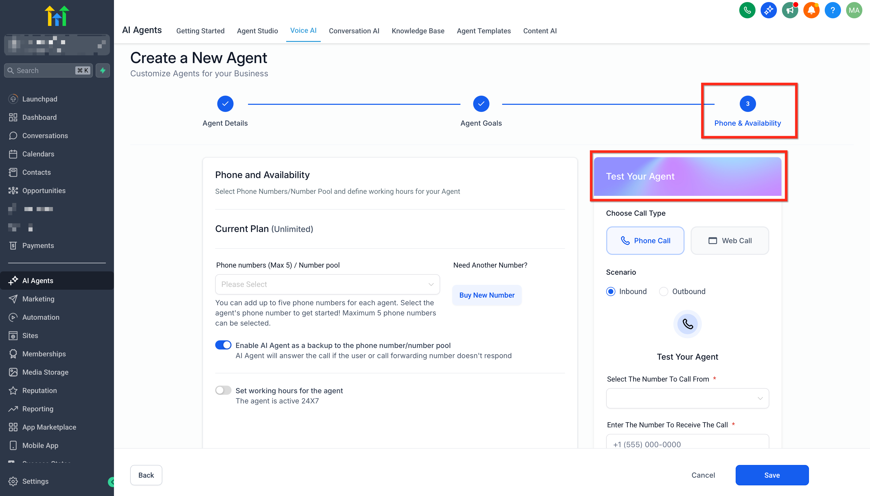 You can also test a Voice AI agent while you are creating it. In the Create Agent flow, use the Test Your Agent panel on the Phone & Availability step to run the same Web Call and Phone Call trials described above. These test calls behave the same way as other trials, including Call History, transcripts, recordings, and summaries.