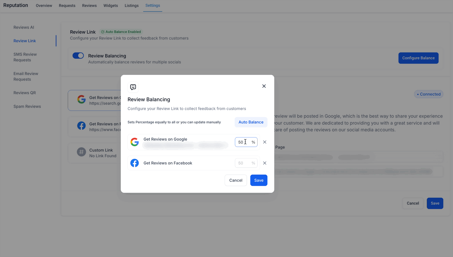- When Review Balancing is enabled for the first time, the default ratio is 50% Google and 50% Facebook (if both pages are integrated).