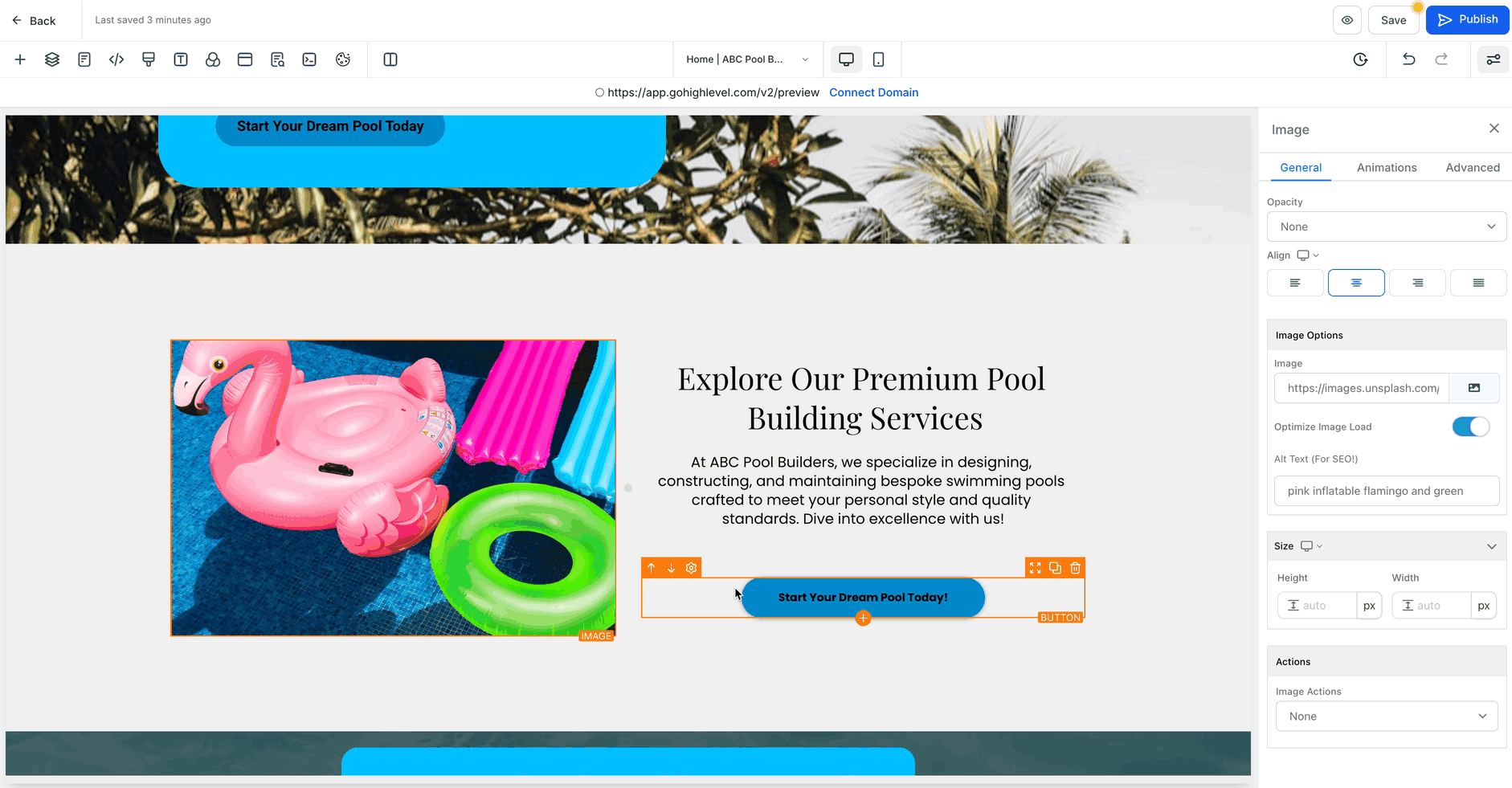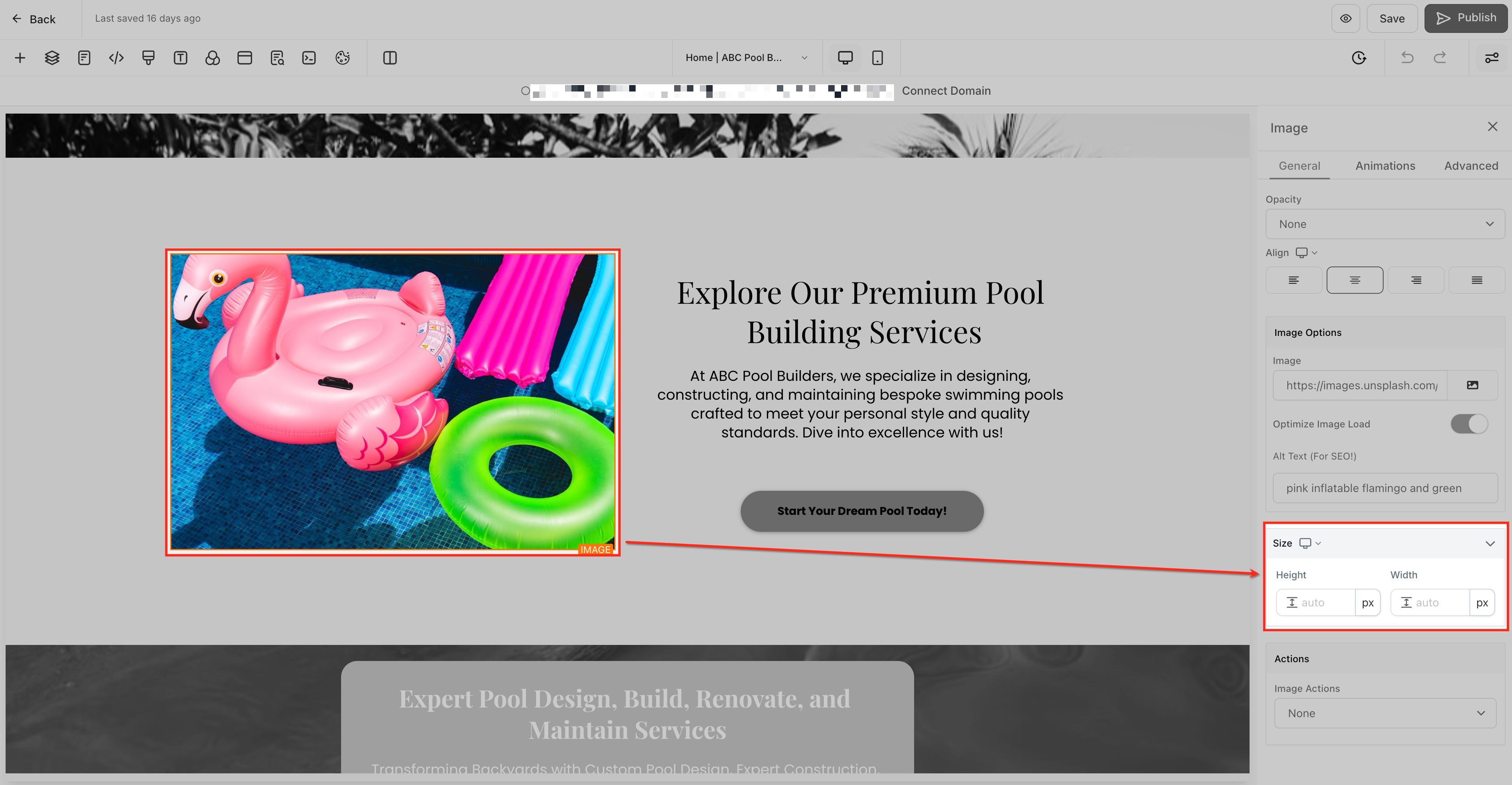 Note: To set different image dimensions for mobile and desktop, use the view toggle at the top of the builder to switch between views. Enter height and width values while in each specific view—changes made in mobile view apply only to mobile, and those made in desktop view apply only to desktop. This allows you to optimize image sizing separately for each device.