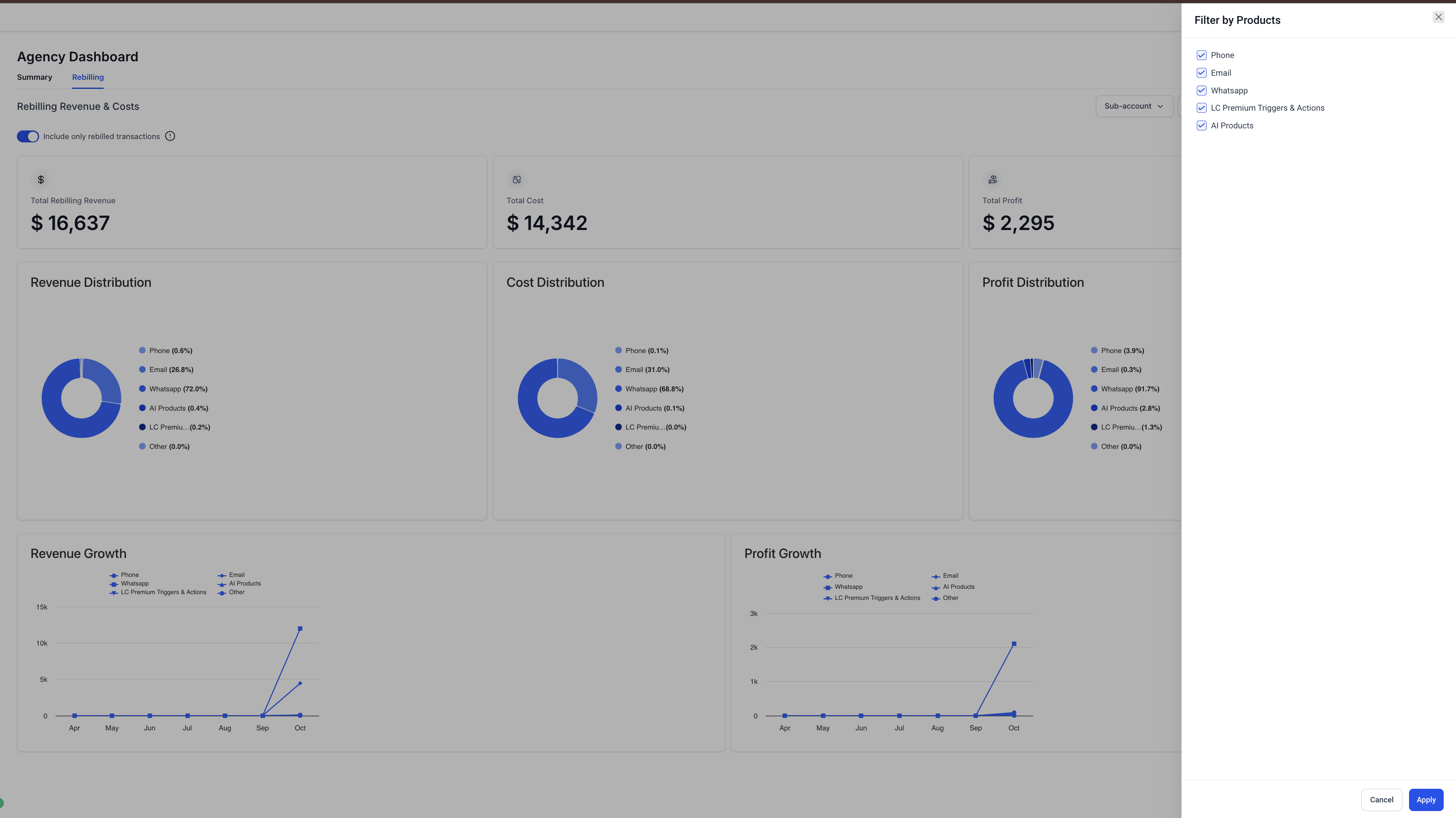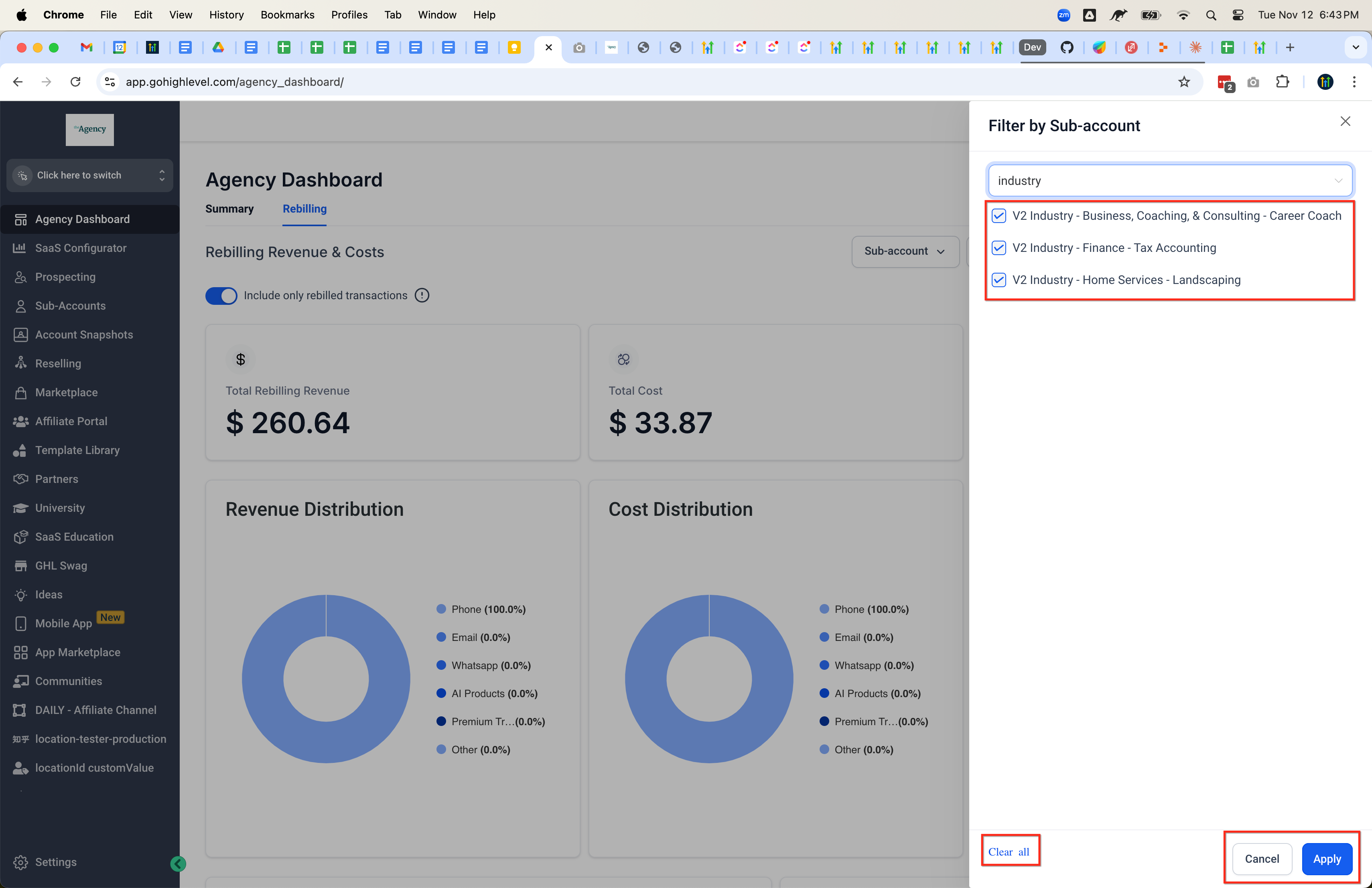 Agencies have clear visibility into their revenue and costs pertaining to Rebilling within HighLevel, which they can slice and dice by each product and each sub-account.