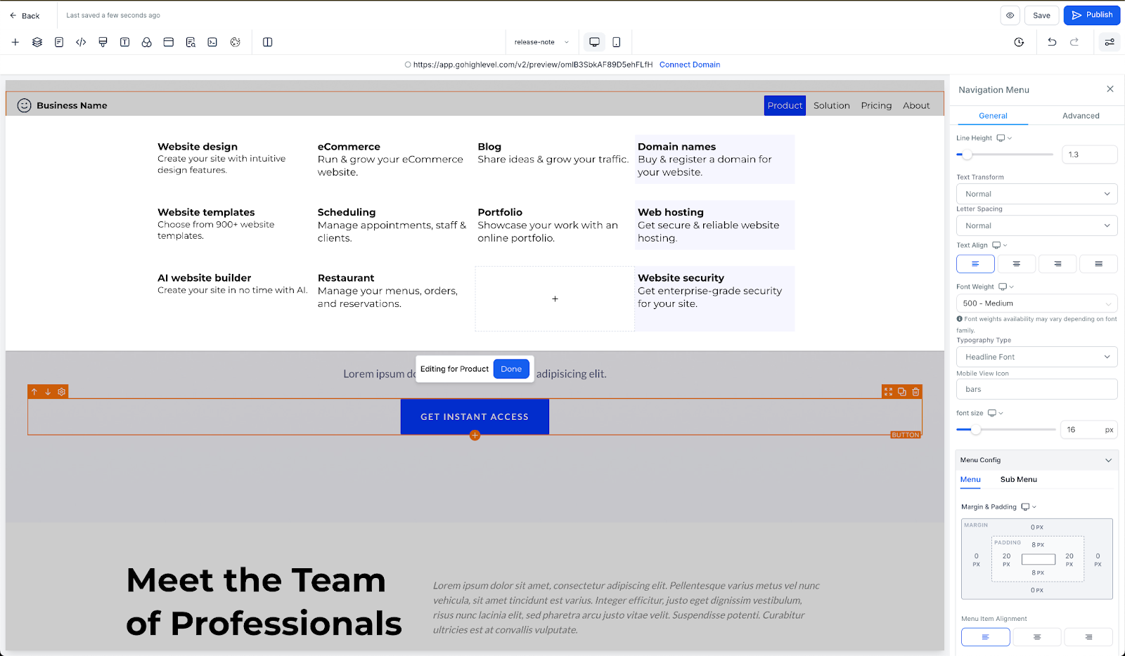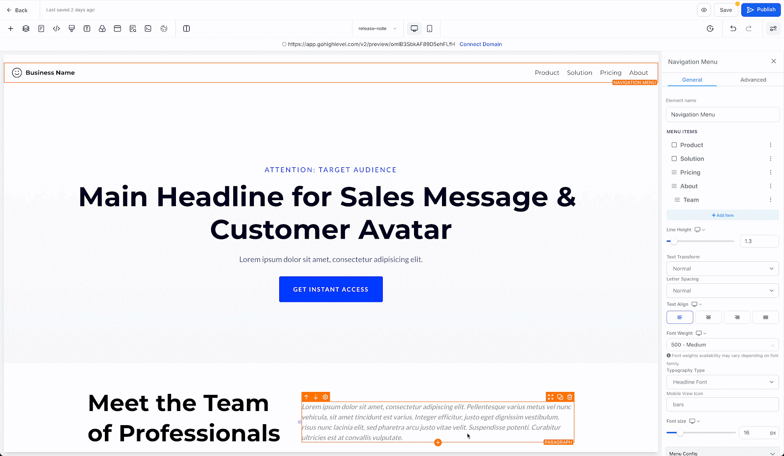 In the HighLevel funnels and websites builder, go to the left sidebar, select elements and add the new navigation menu.