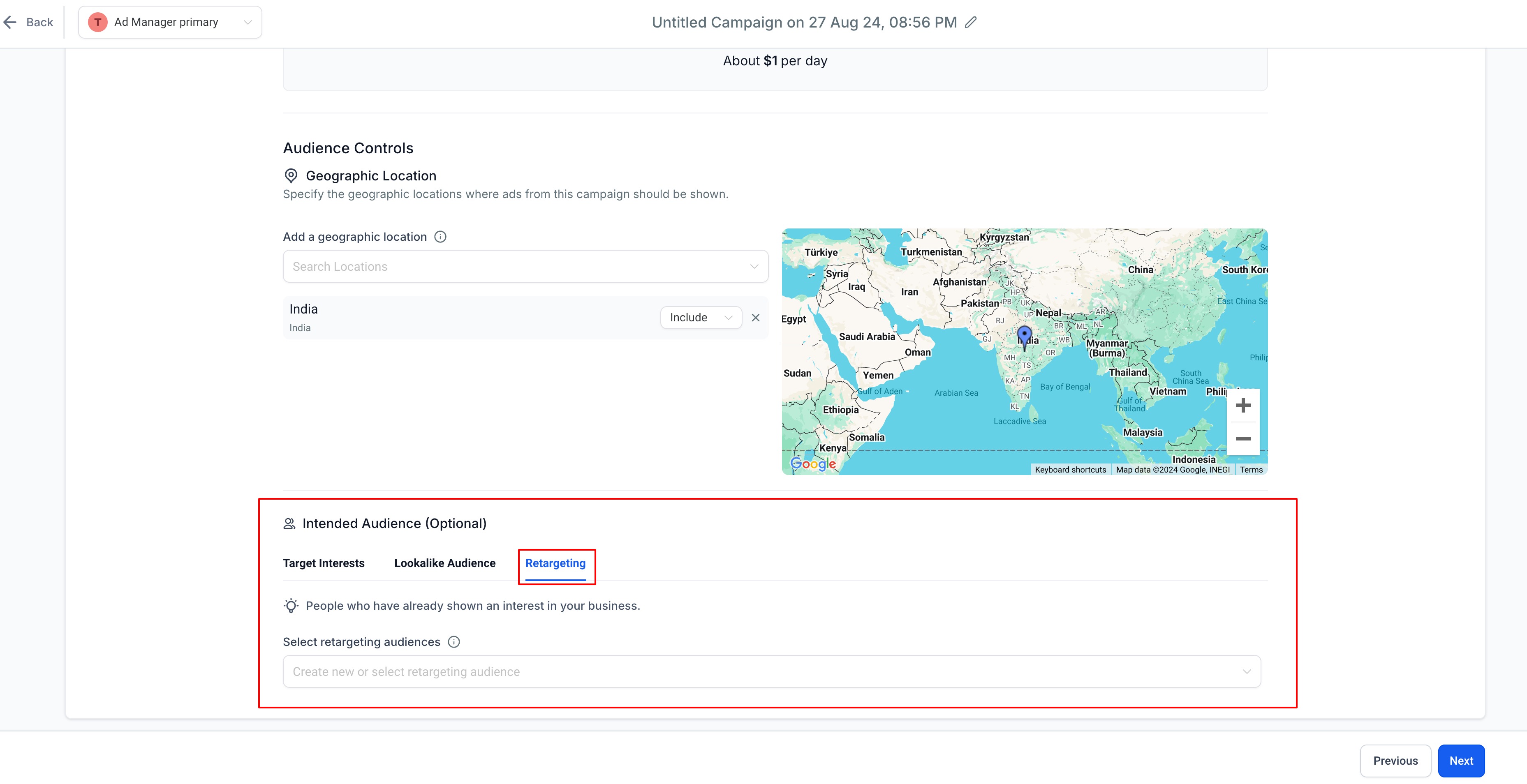 Once created and ready, the audience appears in the Retargeting Audience dropdown and in the Audiences tab.