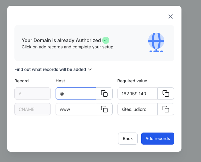 Click on Configure next to the Purchased Domain to open the settings. You can manage the domain in two ways: