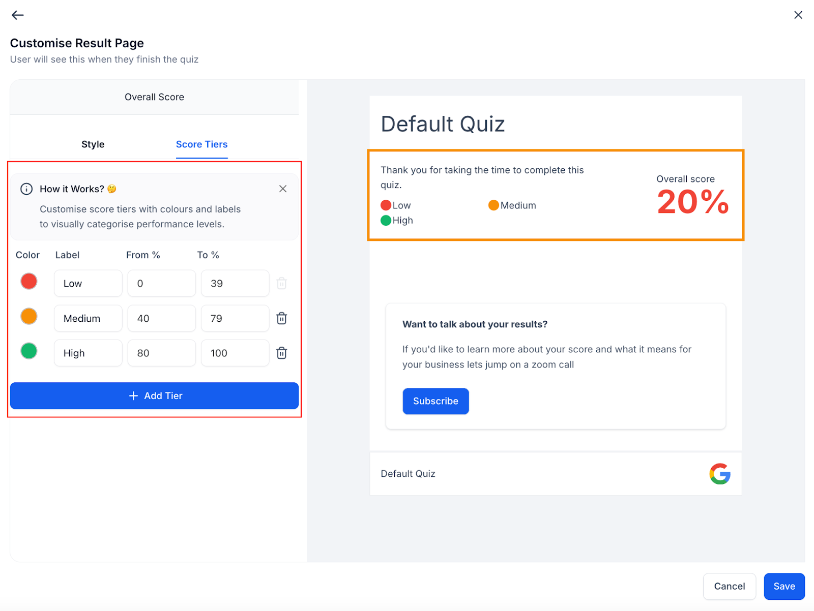 Define your score ranges (for example, Low: 0–40%, Medium: 41–70%, High: 71–100%).